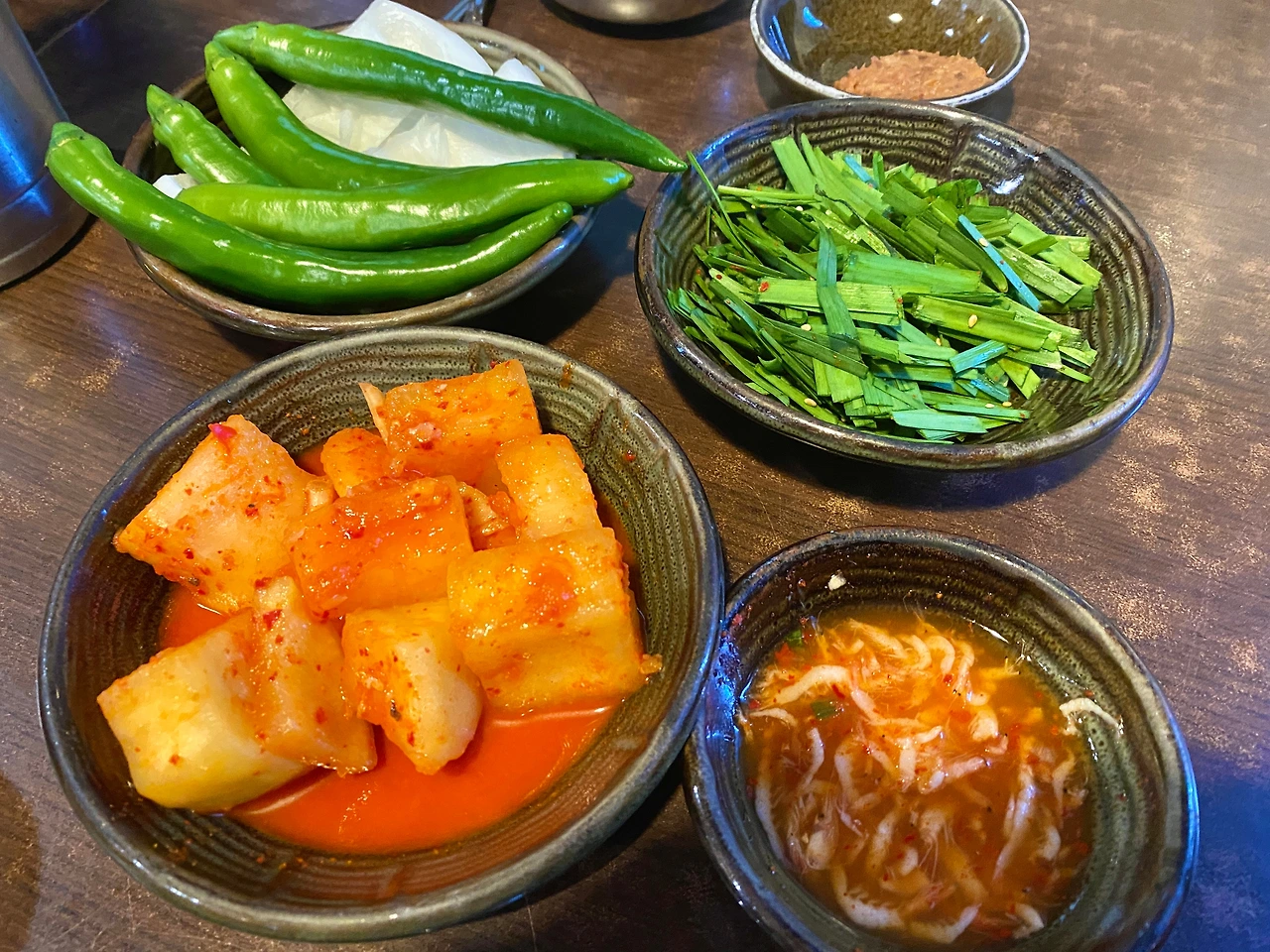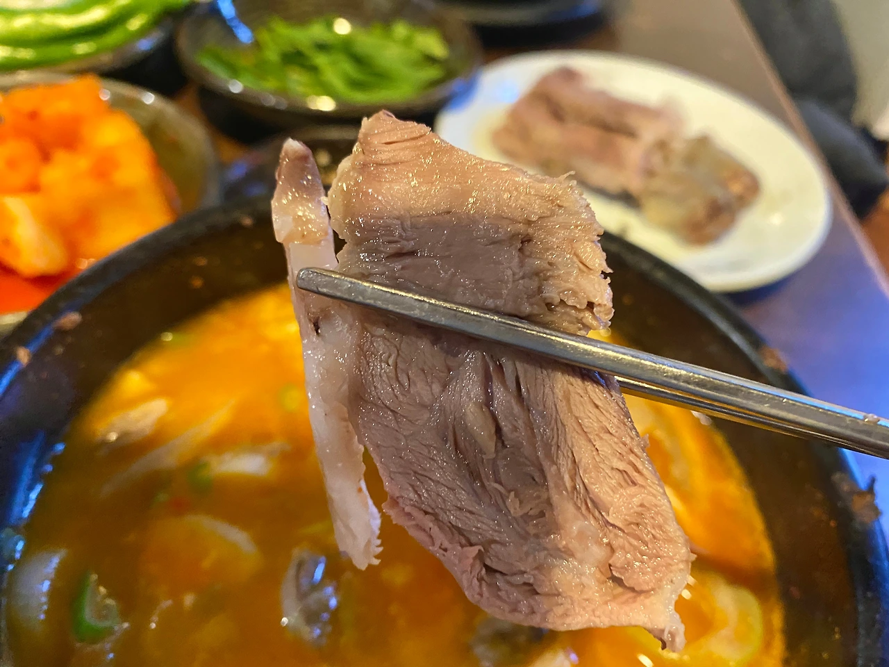 그렇게 착석과 함께 빠르게 테이블은 세팅되었다. 깍두기, 양파, 고추, 부추, 된장, 새우젓. 깍두기는 적당히 익은 정도다. 새우젓은 일반 새우젓 대비 큼직한 것이 육젓만큼은 아니지만 오젓 정도는 되어 보이기도 하고. 된장에도 주목하면 좋겠다. 메주콩의 색상도 그렇고 일반 된장이 아닌 담근 장의 냄새가 나는데, 맛도 그렇다.