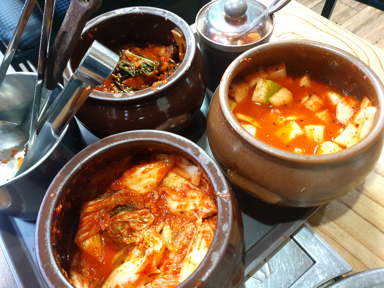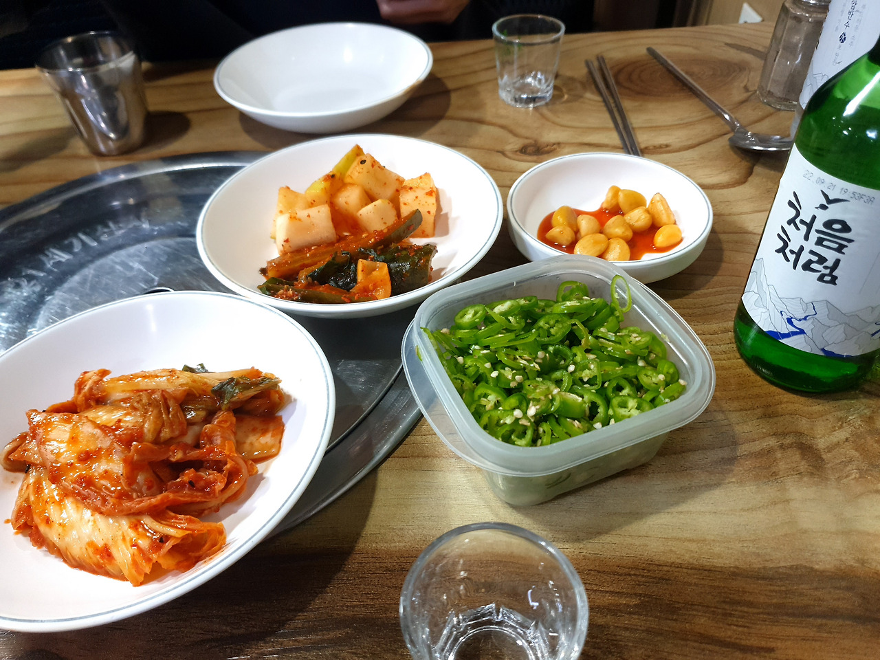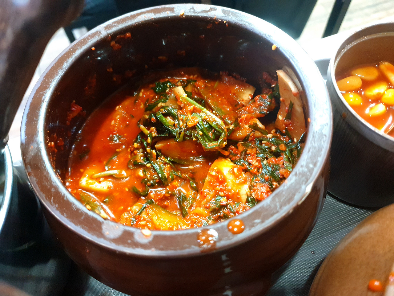 김치 3종과 마늘장아찌가 먼저 등장했다. 특이한 건 정구지가 함께 들어간 오이김치. 아주 푹 익어 숨이 죽을 대로 죽었다.