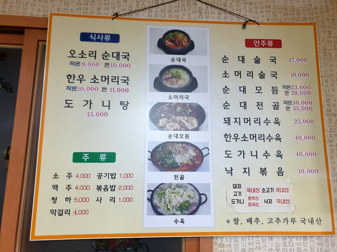 처음 온 집은 가장 상단 또는 대표부터. 오소리 순대국, 순대 모듬(작은), 소주 한 병을 주문한다.