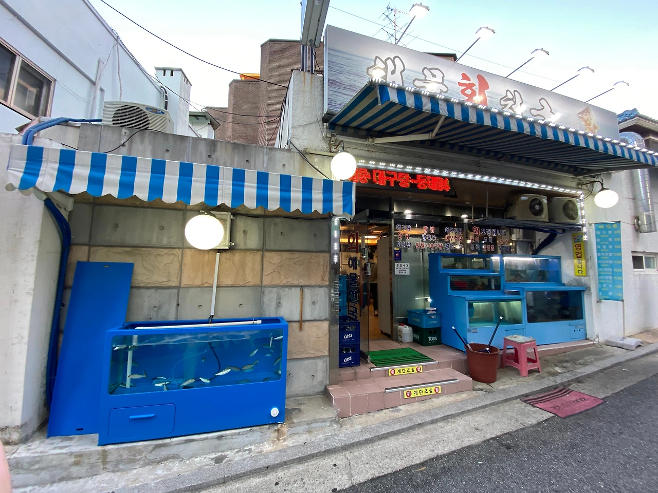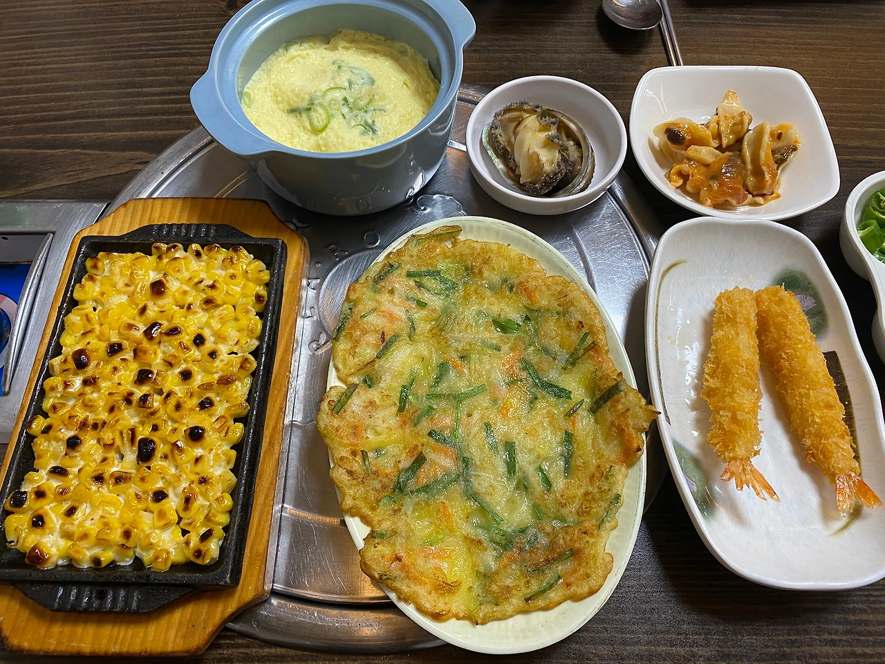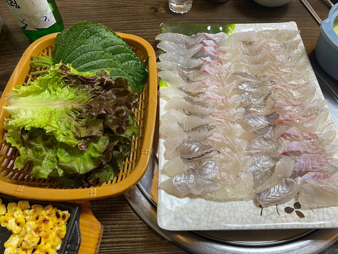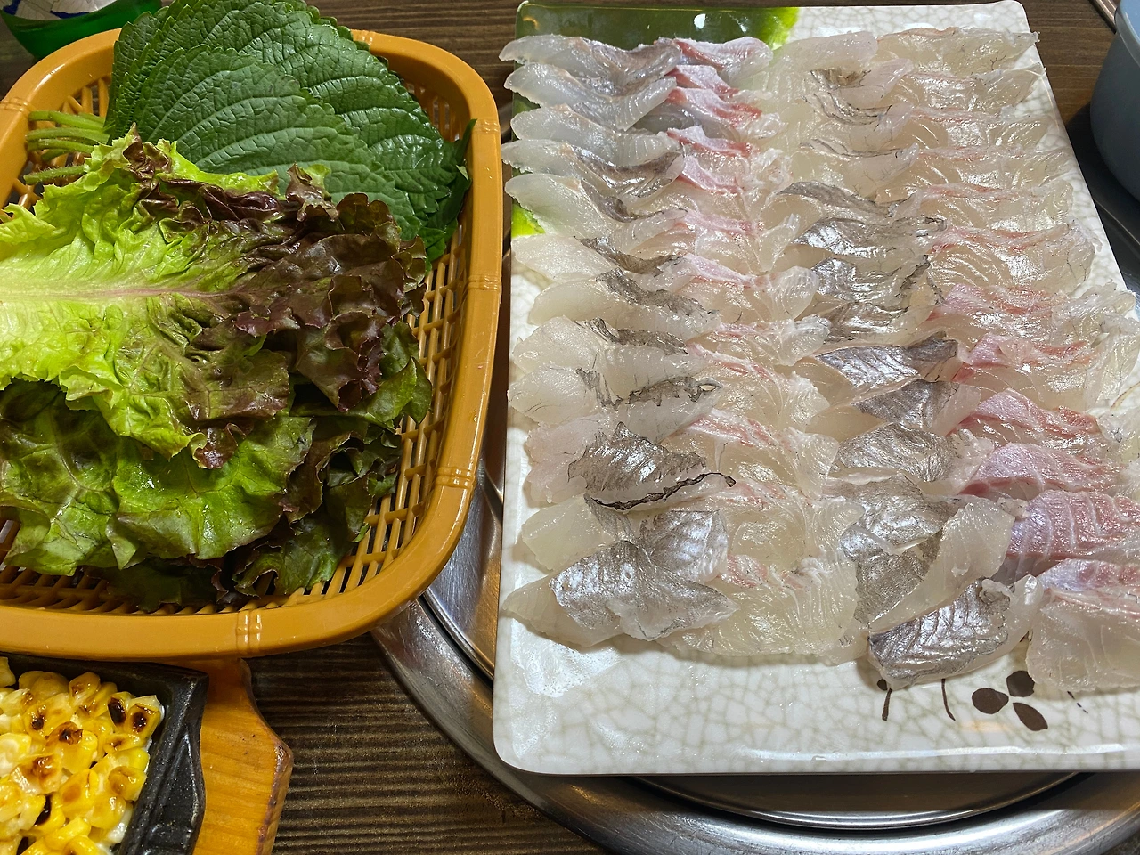 기본 스끼다시들이다. 계란찜은 간이 좀 있는 편이었다. 전복, 새우튀김. 그리고 멍게. 수조를 탐색해 보았을 때 멍게는 양식 멍게로 추정된다. 부침개는 감자를 살짝 섞은 것인지 감자전의 식감이 함께 느껴진다. 부산 해운대의 박선장횟집과는 또 다르게 워밍업의 스끼 느낌. 구워진 옥수수는 치즈가 아닌 마요네즈를 살짝 깐 맛이다. 달콤하다.