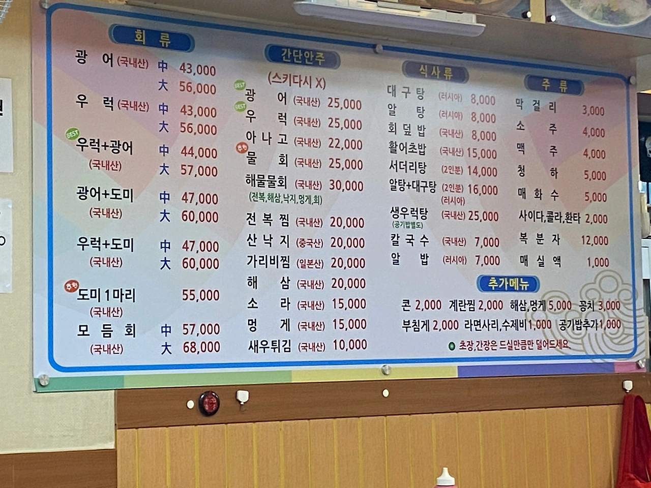 가을 전어는 자주 접해 패스. 스끼가 포함된 우럭+도미 中짜를 시키기기로 했다. 처음 만난 횟집을 탐색하기에 만만한 녀석들이다.