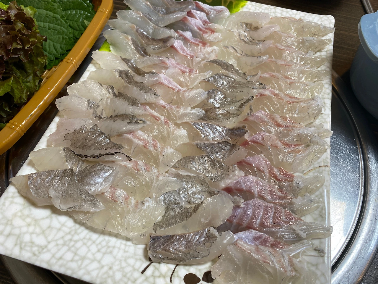 육안으로 보기에도 숙성회였는데, 선택이 틀리지 않은 것 같은 느낌. 빛깔은 사진 보다 훨씬 영롱했다. 우럭 한 줄, 도미 한 줄 번갈아가며 놓여있는데 한 점을 접하는데 제대로 된 녀석, 찾았다. 내 슬세권 친구. 머릿속 지도에 합류할 집 근처 생선회의 욕구를 해소시켜줄 친구. 드디어 찾은 듯했다.