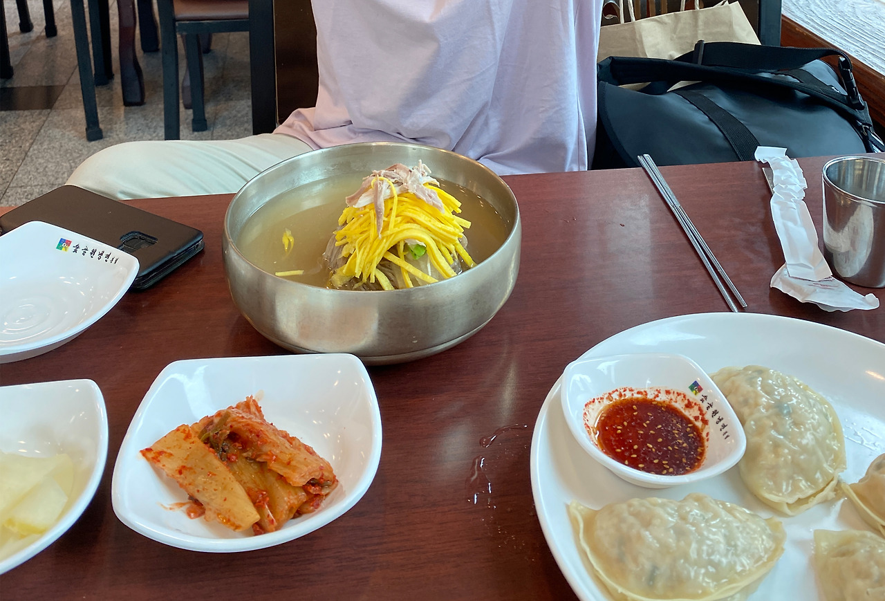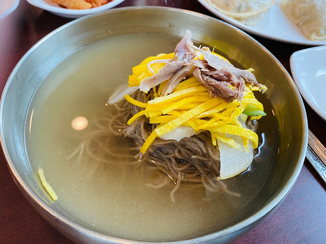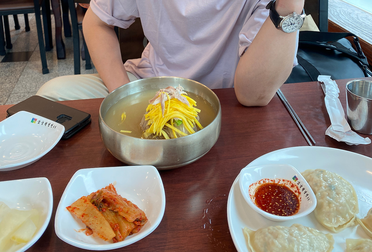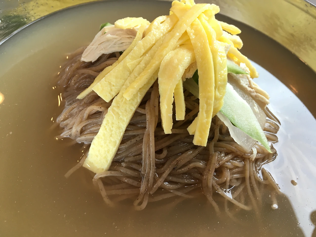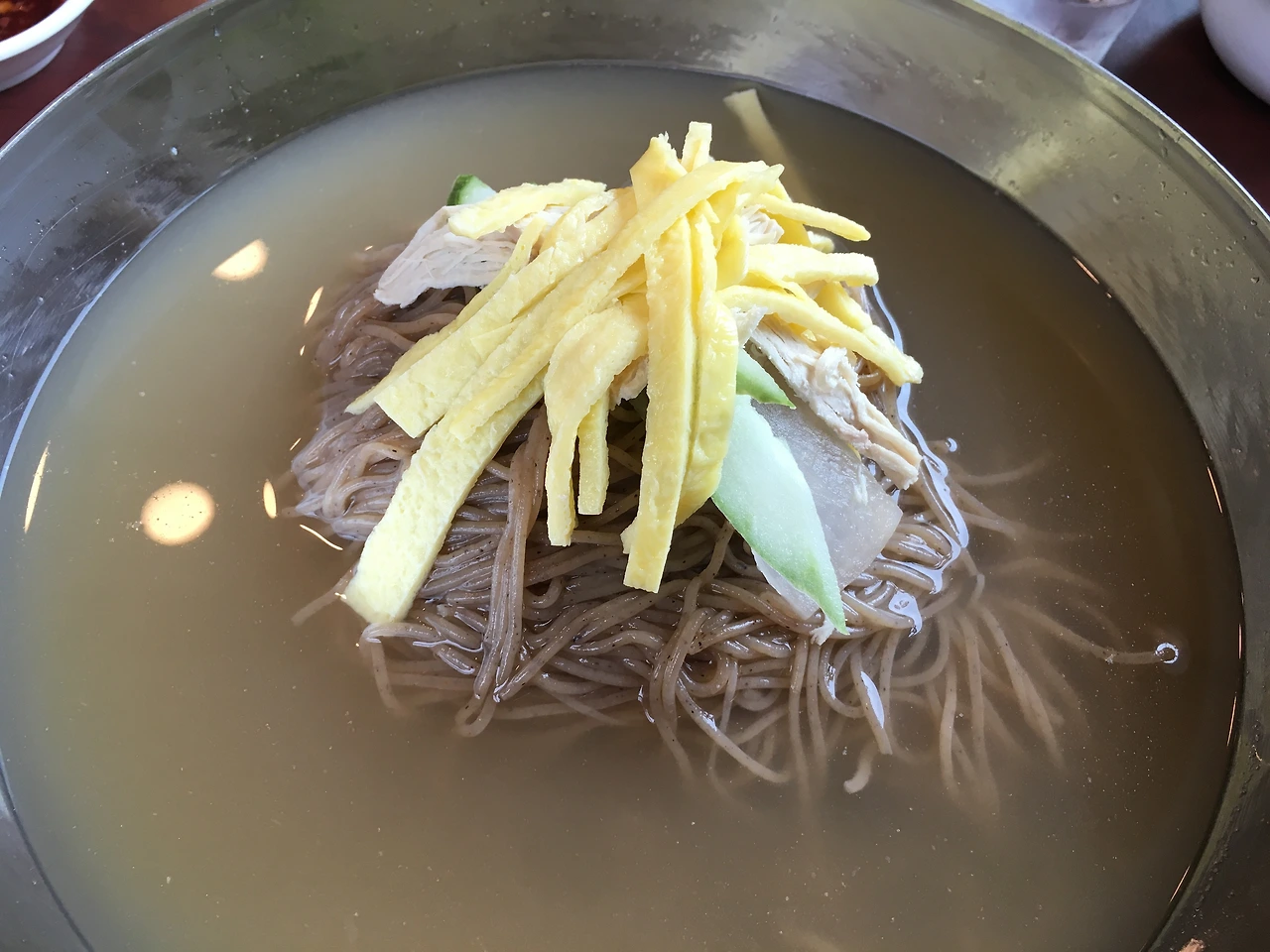 먼저 사진은 물냉면. 고명은 계란, 오이, 무, 닭고기 고명이 올라가는데, 시큼한 맛이 지배적이다. 평양식 냉면을 찾아온 외지인들이 물냉면을 주문했다간 낭패를 볼 수도 있으니 유의하자.