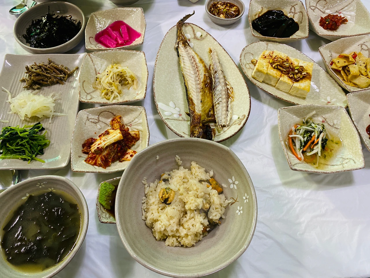 기본찬 외 고등어구이도 함께 나오며, (그래서 밥 한공기 치고 값이 있다.) 나물들은 홍합밥과 함께 비벼 먹기도 따로 먹기도 좋다.