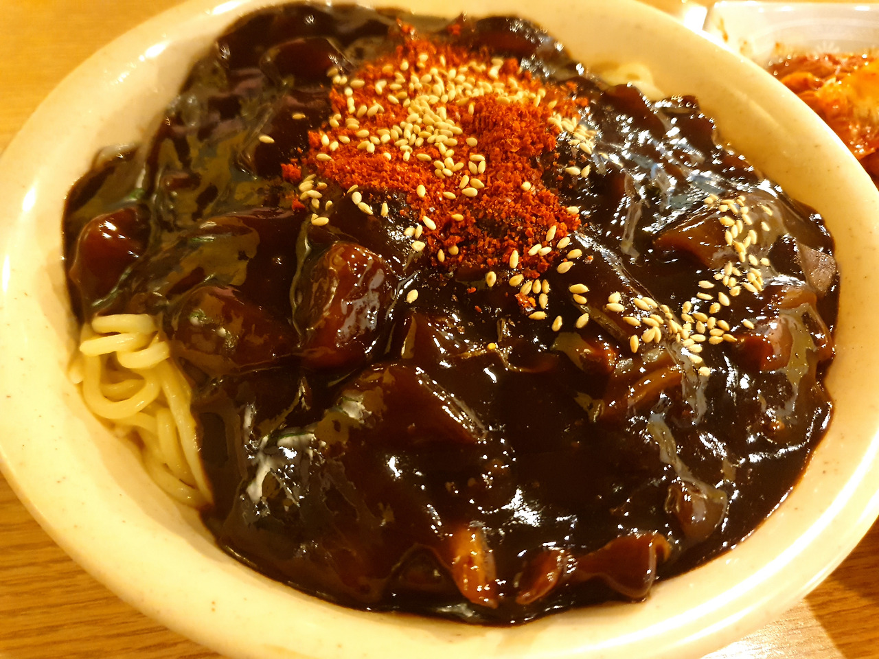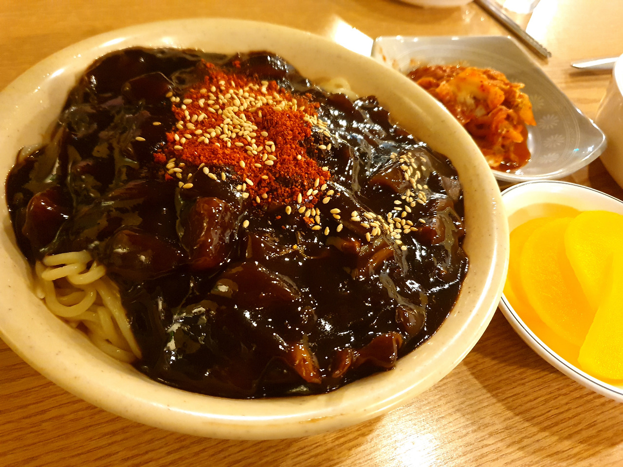 이어 등장한 짜장면이다. 오늘은 곱빼기였다. 묻고 따지지도 말고, 기본 자체가 깨와 고춧가루가 뿌려진 짜장면. 정말 의아한 점은 이곳의 짜장면은 중국집의 짜장면보단 살짝 가벼운 맛이 있음에도 감칠맛이 좋아, 일반적인 중국집보다는 하이퀄의 깊은 맛이 느껴지기도 한다는 점이다.