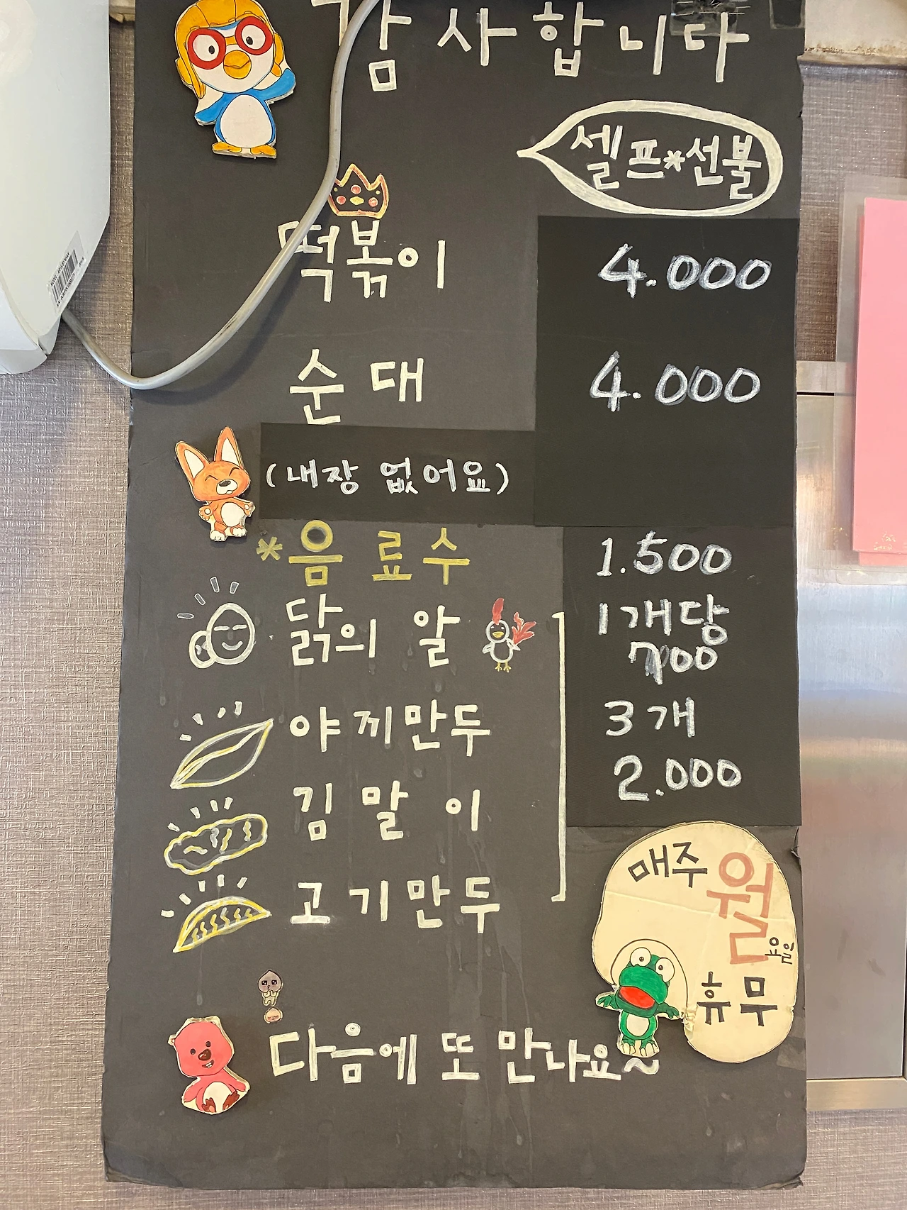 - 메뉴는 떡볶이, 순대, 만두, 떡볶이 곁들임으로 상당히 단출한 편. (주류는 불가하다.)