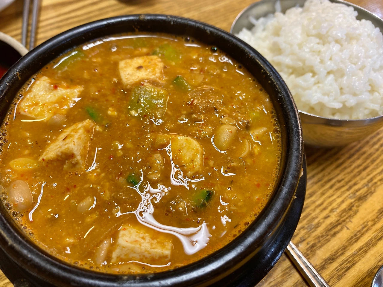 청국장이 나와주며 본격적인 식사 시작. 콩을 다루는 집답게 콩의 비중이 많은 청국장. 두부와 애호박 정도로 구성된 청국장인데, 가볍게나 두부를 맛볼 기회. 한 입 뜨는데, 으음? 두부가 예사롭지가 않다. 두부의 모양은 하고 있는데, 입에 넣는 순간 퍼지는 맛. 진한 청국장 맛에 가려졌으나 꼬소한 향도 스멀스멀 기어 나오는 것 같은데.