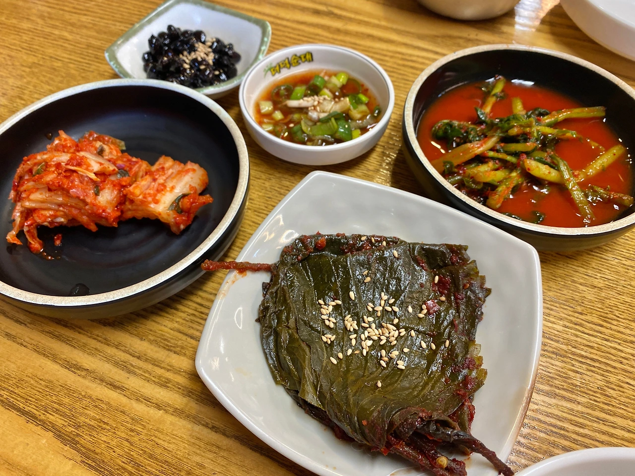 더해 두부부침과 화력을 발휘한 것이 기본 찬들. 각기 찬들과 장에 찍어 먹는 맛이 다 제각각. 신김치에 싸 먹어도 그만이며, 깻잎지 얹어먹어도 그만이다. 파간장이라 해야 할지, 저 장은 새우젓 비스무리한 찝찌름함이 강하게 느껴졌는데. 절여진 파들을 얹어 먹어도 그만이더라.