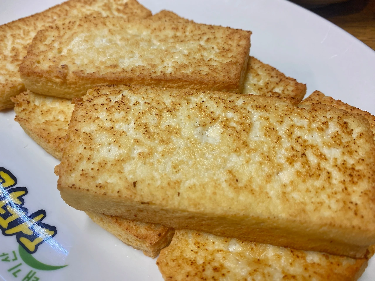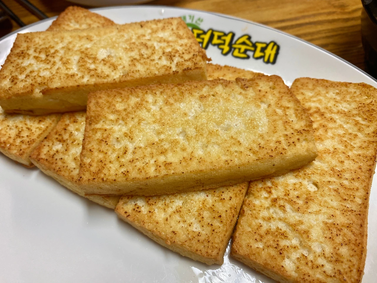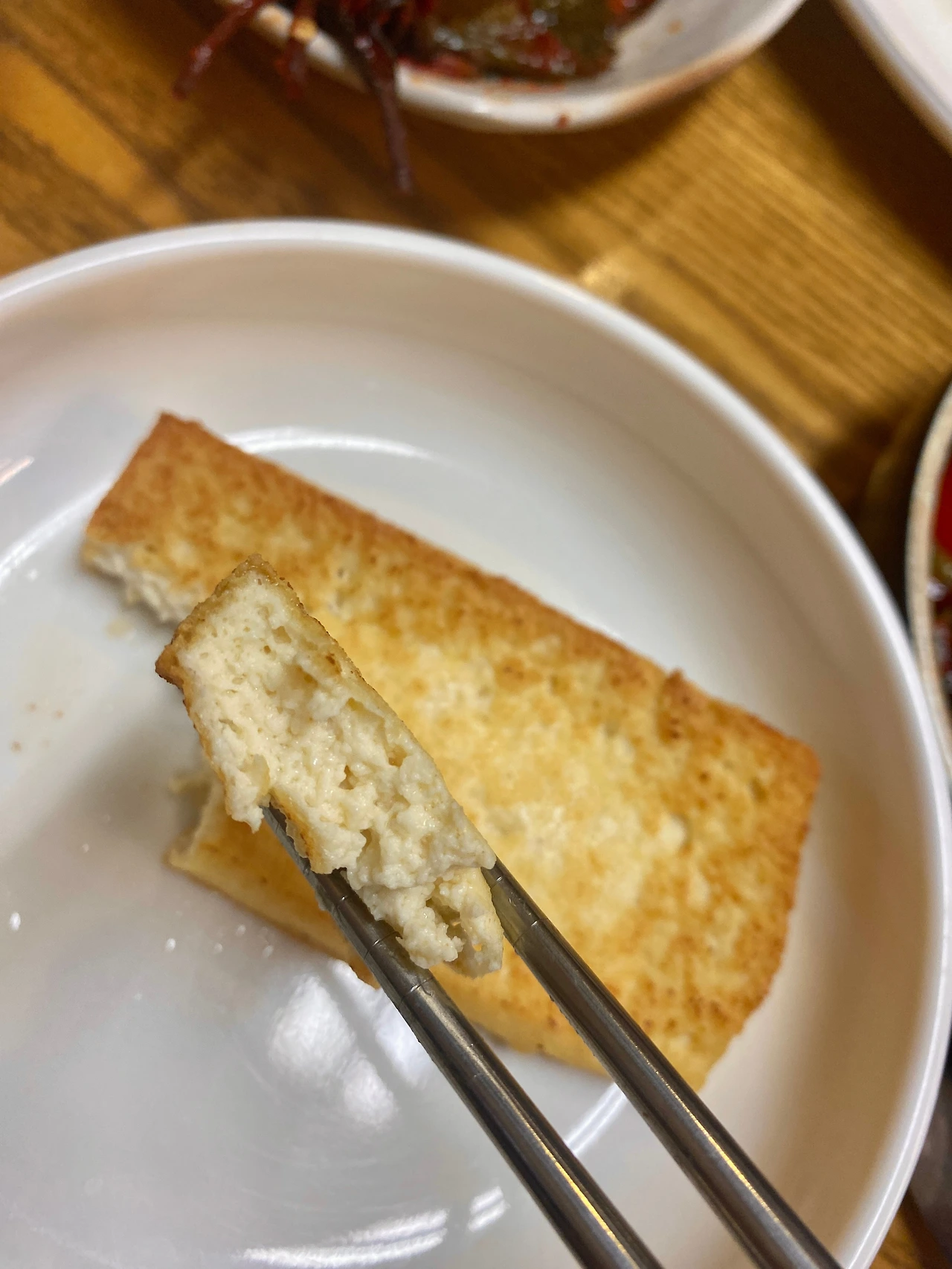 아, 이거 굉장히 훌륭하다. 마찬가지로 부쳐 내어 질겨진 겉면과 다르게 속은 굉장히 부드럽구나. 두부의 입자들이 느껴지기도 한다. 속은 이리 부드러운 것이 어찌 이런 모양을 유지 중인 것인지 싶을 정도. 고소한 향도 자비 없이 입안에 퍼져나간다.