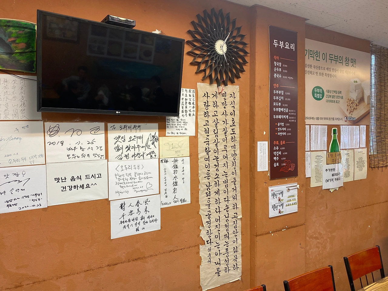 자리를 잡고 앉았다. 유명인들의 사인 및 글귀들이 황톳빛 벽면 곳곳에 붙어있더라. 게다가 흘러나오는 나훈아의 음악. 참 좋다.