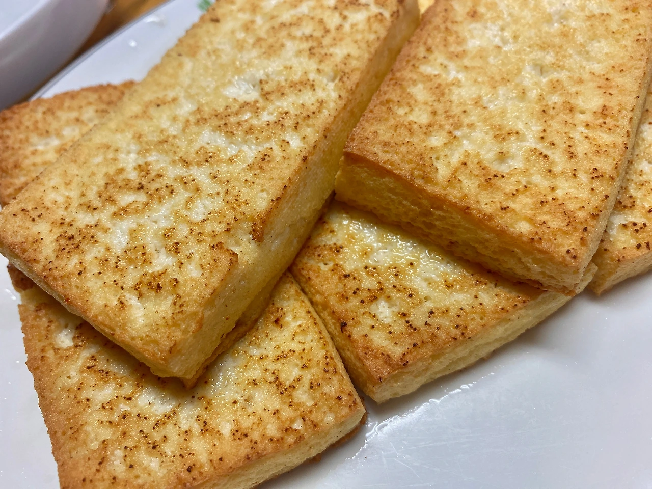 두부가 그래서인지, 부친 모양에서부터 단면의 구멍, 공기층이랄까? 그런 게 불규칙한 단면이 보이더라. 때문에 부쳐진 색감 또한 굉장히 먹음직스럽다. 자, 한 입을 베어 물어보는데.