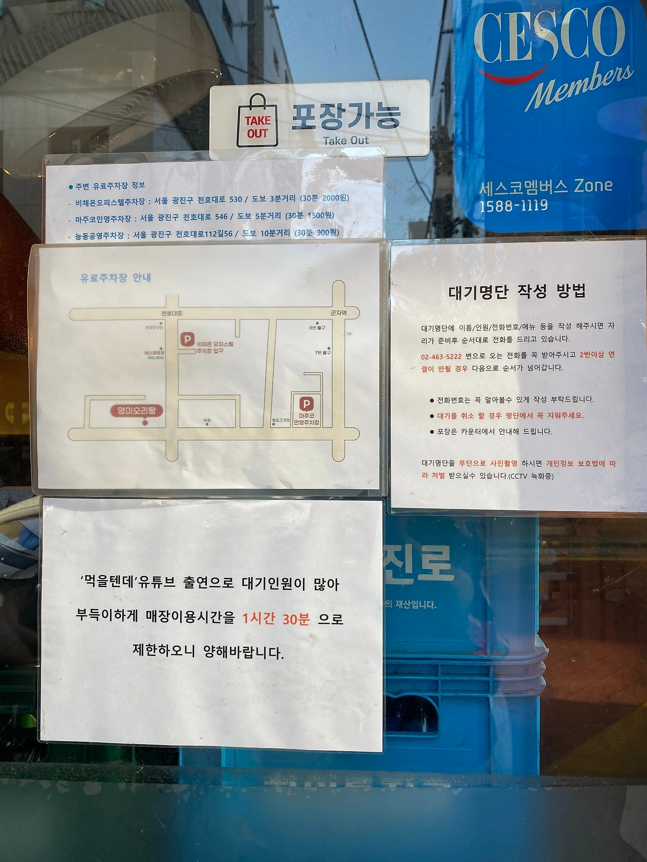 도착한 '영미오리탕'의 입구. 인근 유료주차장의 정보 및 대기, 시간제한 관련해 한눈에 확인이 가능하다. 필자도 명부에 이름을 적고 대기하는데, 앞선 대기자들은 적었으나 역시나 음식은 무거운 탓인지, 꽤나 오랜 시간을 기다렸던 것으로 기억한다.