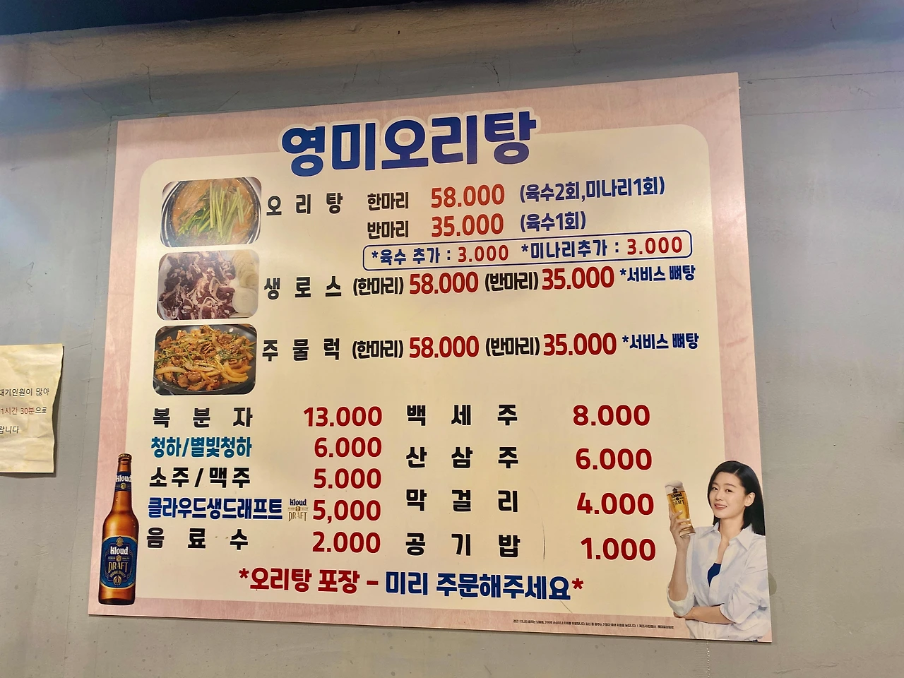 웨이팅 25분 뒤에 입장. 오리전문점답게 익숙한 메뉴들이 포진되어 있고, 가격대는 역시나 무거운 편. 익숙한 오리로스, 주물럭과는 다르게 저 오리탕은(들깨식) 오리집에 가면 없거나 사이드격의 한방오리탕 정도였는데, 이곳에선 가장 상위에 포진된 메뉴이자 선발투수다. 2인 기준으로 오리탕 반 마리로 주문한 필자인데, 대기 명부에 미리 메뉴를 적어두는 시스템이니 이 또한 참고하면 좋겠다.