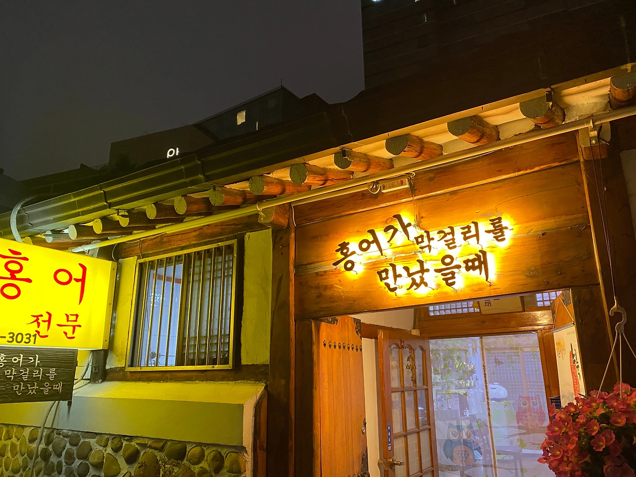 사진과 같이 골목은 인적이 드물어 조용한데, 유독 진한 조명의 밝기로 유혹 중인 홍탁집, '홍어가막걸리를만났을때'.