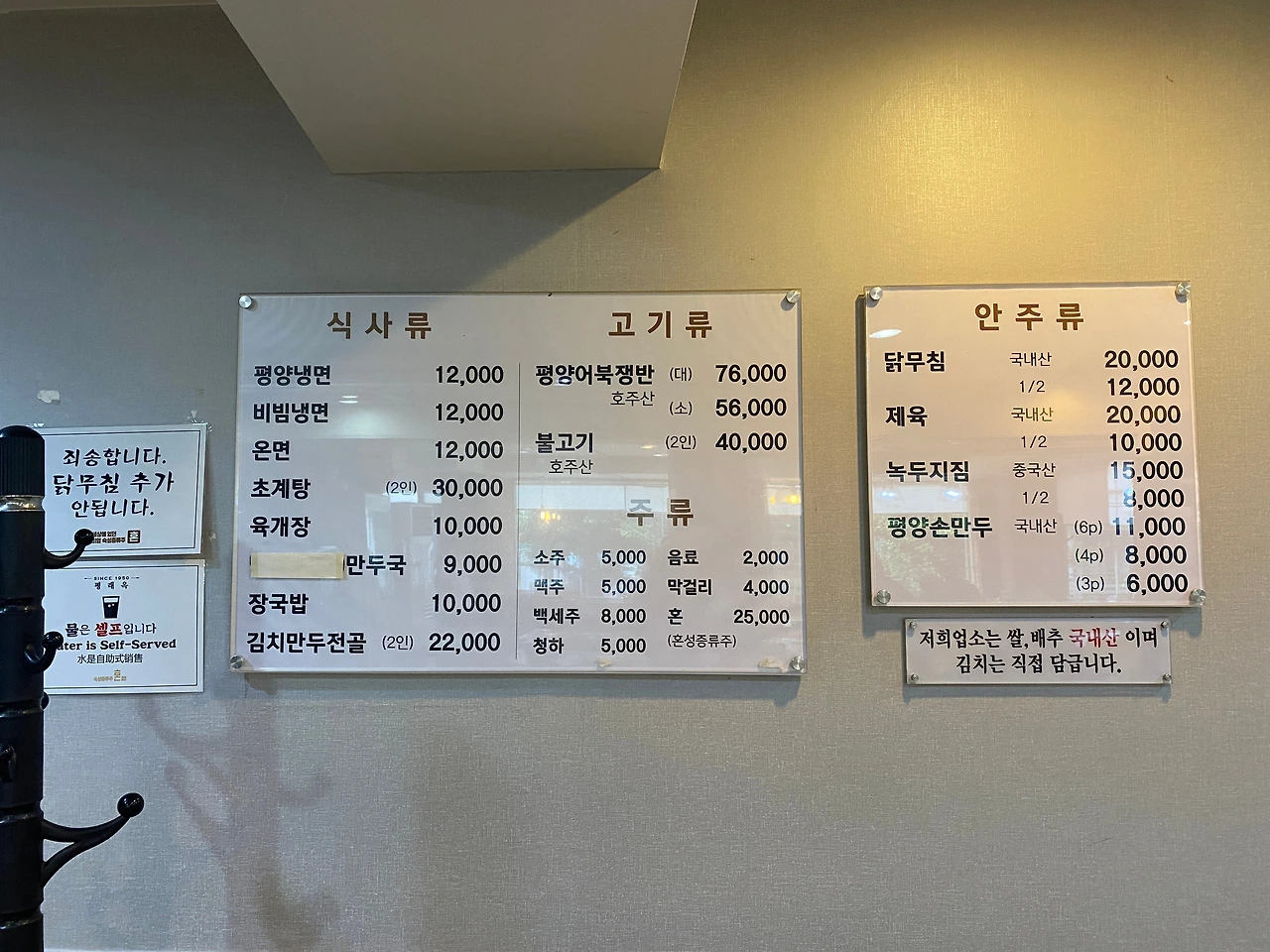 그렇게 자리를 잡고 앉아 주문부터. 이런 이유였구나. 들어가자마자 실내 공기를 통해 다른 평양냉면집 대비 여러 음식의 냄새가(국밥집스러운) 섞인 느낌을 받았는데, 메뉴가 상당히 많은 편이다. 필자의 경우 평양냉면 2인과 만두 3개짜리를 주문.