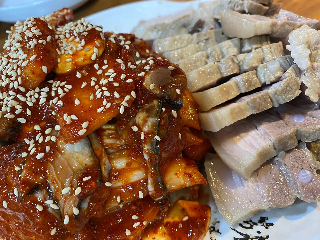 오래간만이구나. 굴보쌈. 제철에 만나니 더 반갑다. 삼겹 부위가 적당한 두께로 썰려 푹 삶아져 나온 맛. 고기는 굉장히 부드럽다. 잘 삶았다라는 말이 어울리는 수육이다. 어떤 날은 일부 부위가 뭉텅뭉텅 썰려 나오기도 했는데 오늘은 대부분이 일정 간격으로 썰려 나왔다. 상당한 양의 굴김치와 보쌈이 턱 하니 얹어져 있다.