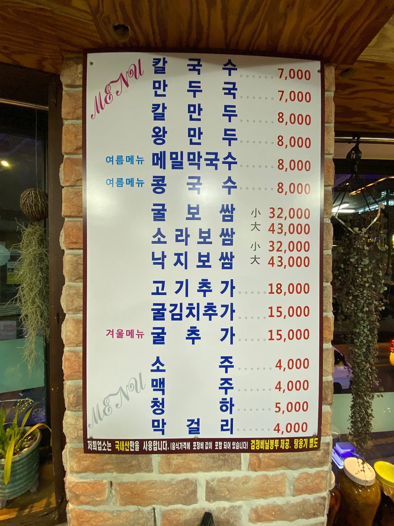 메뉴판을 살펴보자. 역시 강렬하게 보이는 굴보쌈. 소라보쌈, 낙지보쌈도 있으나 필자는 굴보쌈이다. 굴보쌈 小짜로 주문. 칼국수는 킵해둔다. 국물만 인당 한 그릇씩 나오기 때문에 이후에 부족하면 칼국수를 주문. 칼국수는 우동면에 가까운 스타일이니 호불호가 갈릴 수 있을 것이다.