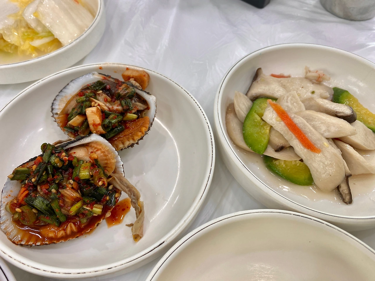 양념장을 얹은 큼직한 꼬막 (피꼬막 같다.) 새송이버섯.