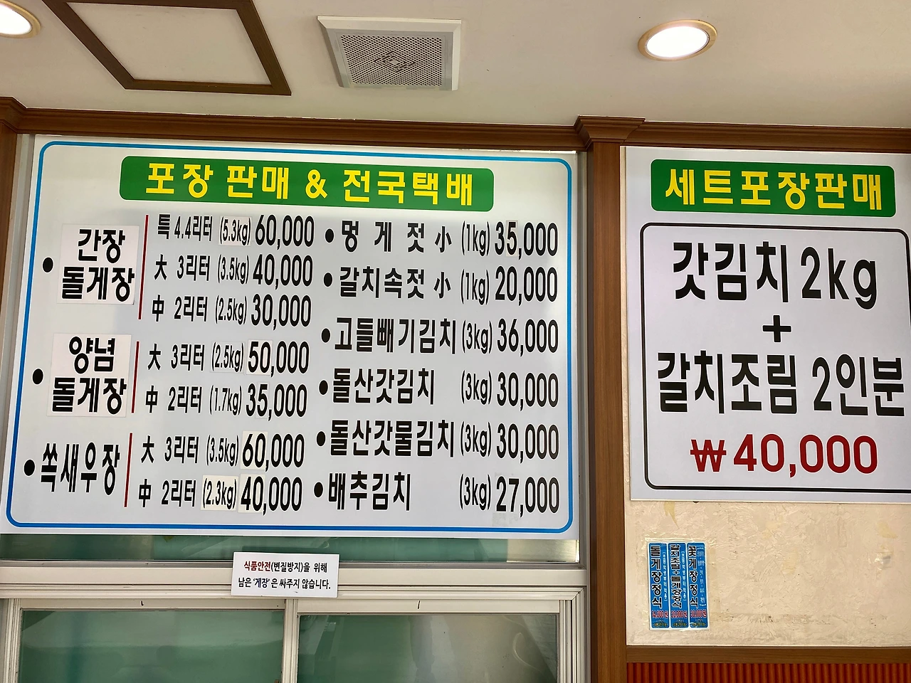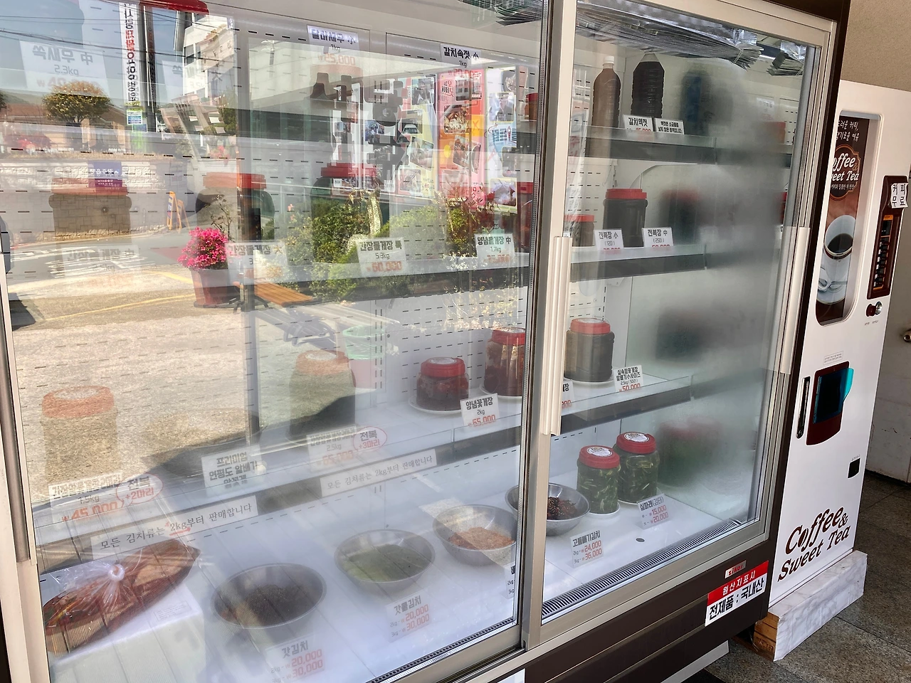 들어가는 길로 포장 판매 중인 녀석들이 보이는데, 냉장고에 그 종류가 진열되어 있는데 가짓수가 상당하다. 게장도 게장이지만, 갈치속젓, 액젓, 전복장에 멍게젓까지. 이야, 멍게젓 참 궁금하다. 더해 김치까지도 판매 중이구나.