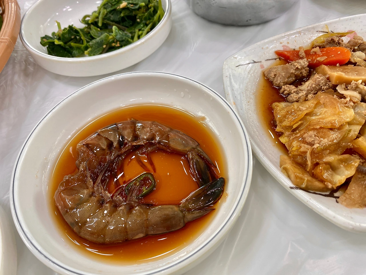 새우장, 돼지불고기, 방풍나물 같았는데 여수에서 참 많이 만나는 듯하다. 그나저나 새우장. 가게에서 포장/택배 판매 중인 달마새우장일까? 보는 것만으론 모르겠는데 꽤나 튼실한 새우.