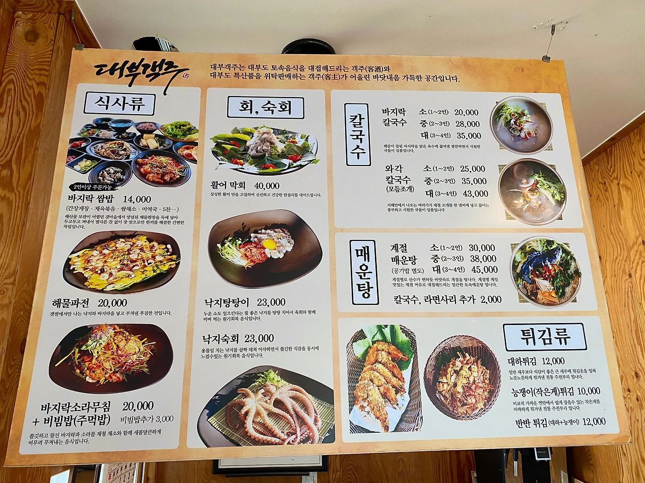 주말 웨이팅이 있다고 들었는데, 역시나 입구에서도 메뉴판 확인이 가능하다. 특이한 건 도시락도 서비스 중이구나. 무엇보다 대부도의 좋은 점이라면 무료 주차 공간이 꽤나 많다는 점.