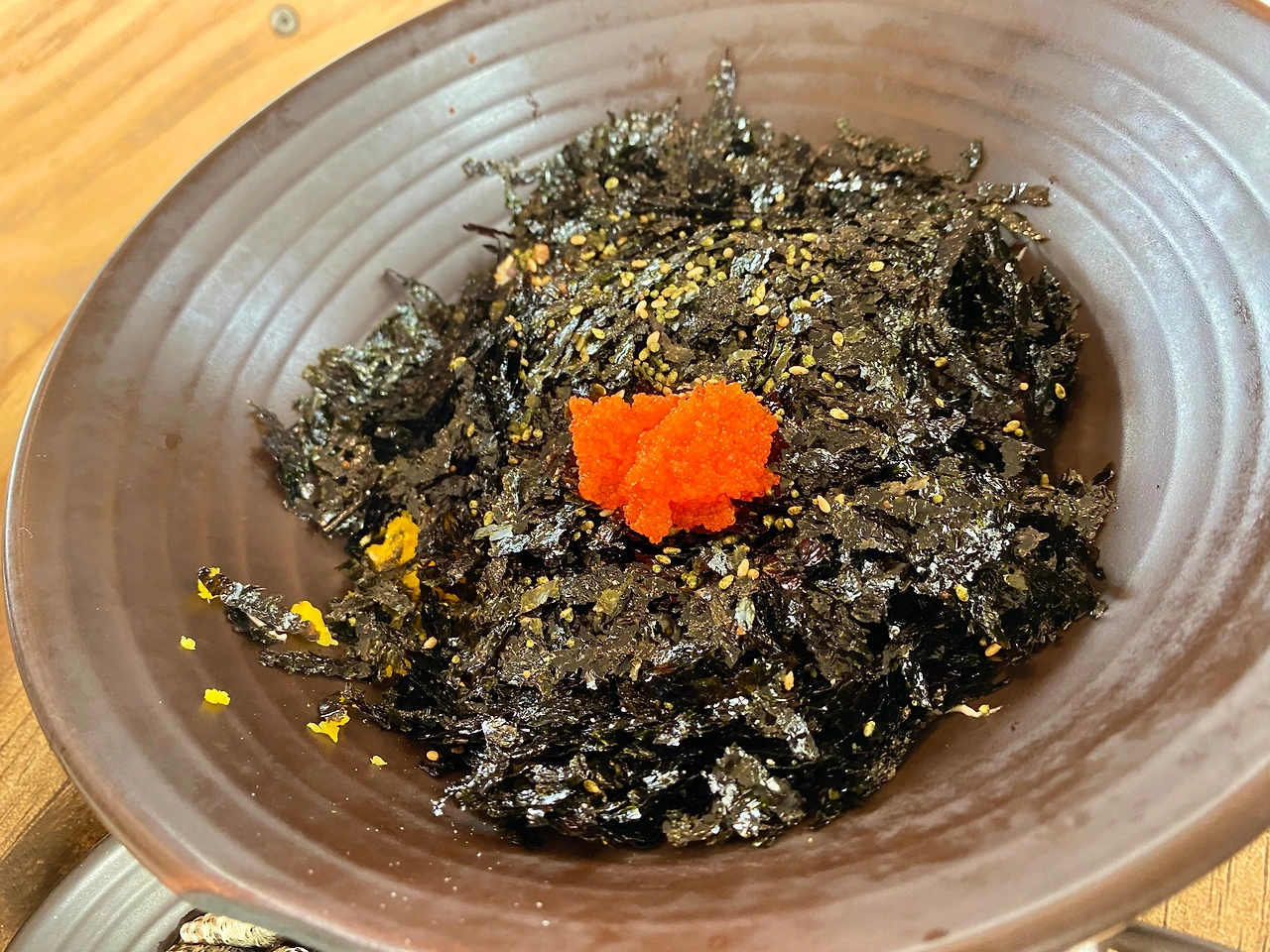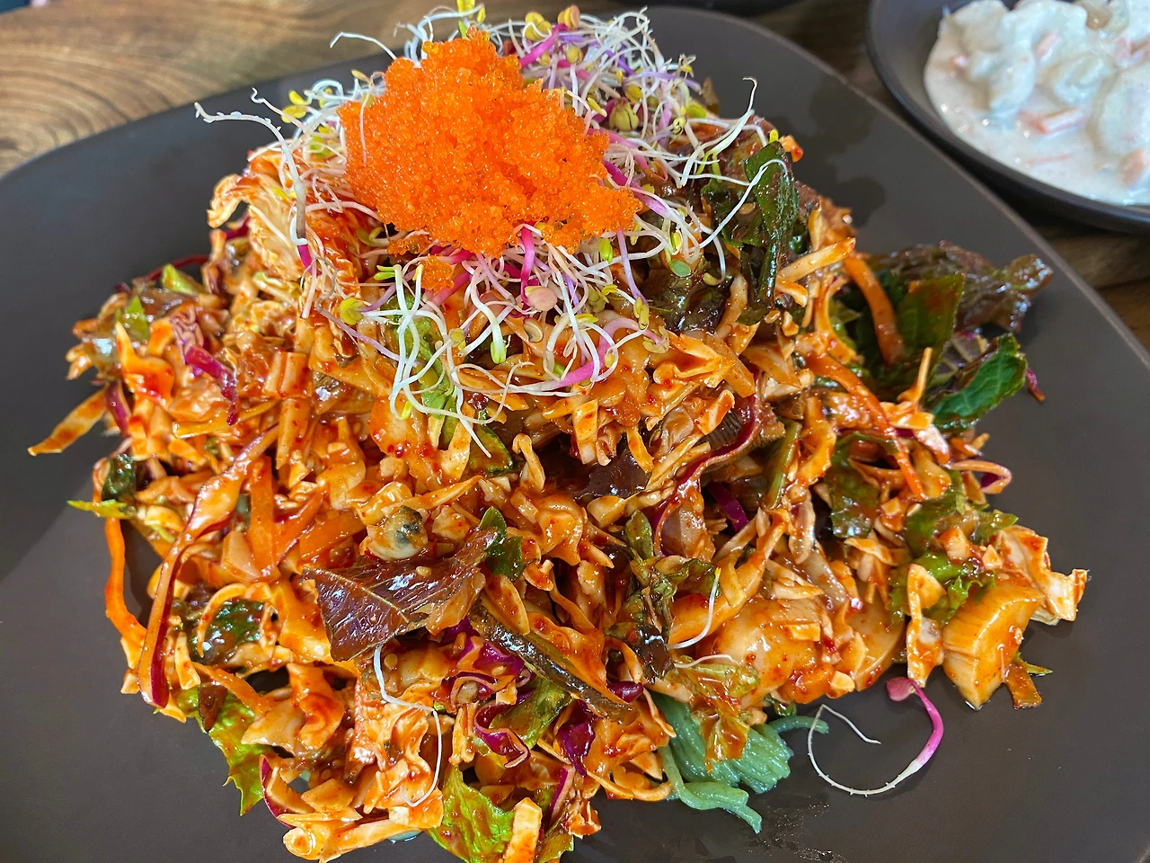 소라도 살이 달달하니 맛나다. 더불어 아래에 깔린 초록의 해초면. 곤약면인가, 해초면인가? 가사리 같은 느낌도 드는데, 굉장히 부담 없는 식감의 가벼운 면. 시판면인 것 같지만 무침과 조화롭게 어우러져 좋다. 센스가 굉장하다.