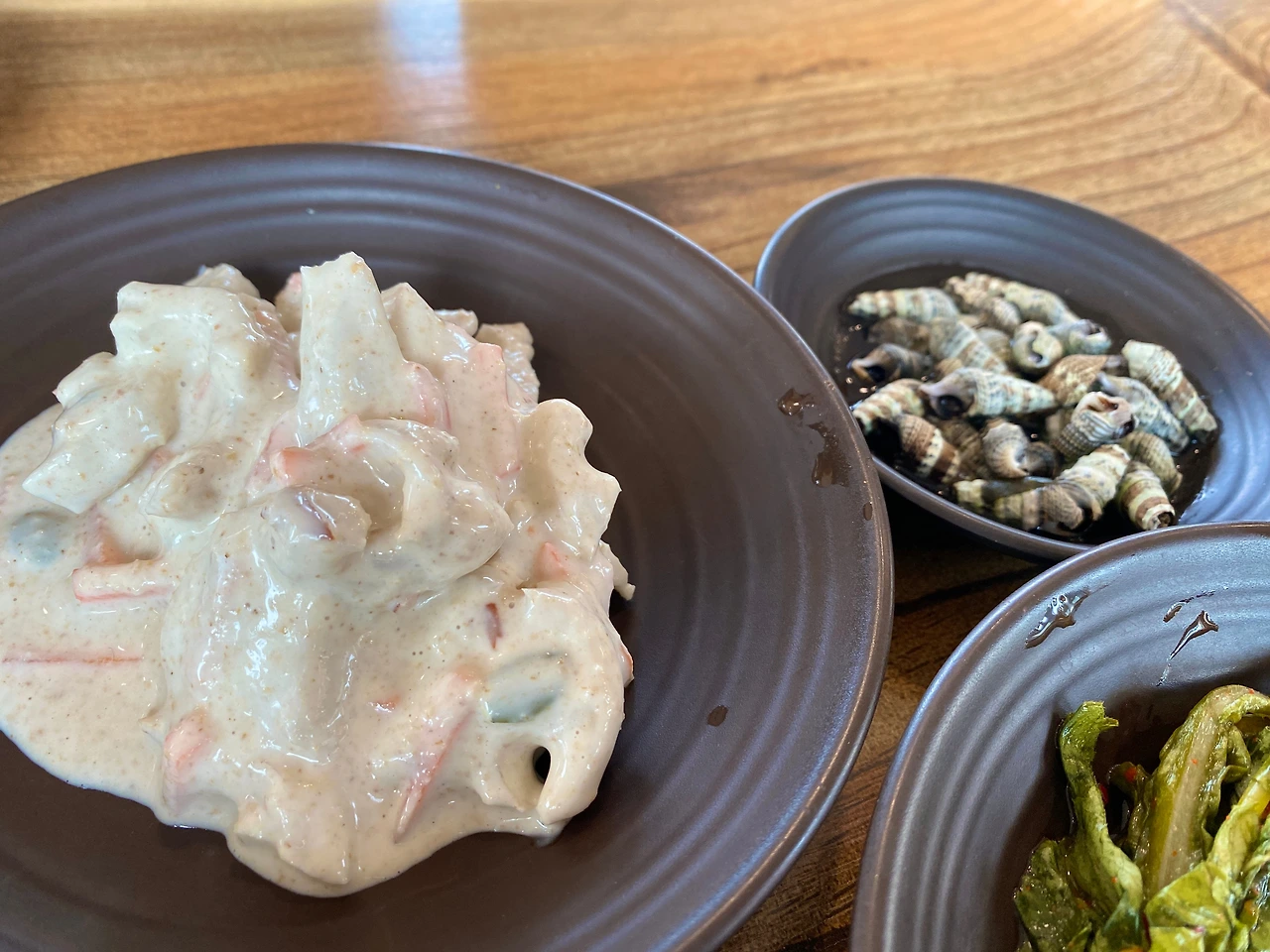 연근 샐러드인데, 들깨 소스를 더한 듯하다. 당근, 호박씨와 함께 버무렸는데, 녀석 또한 무시하지 못하겠다. 손맛이 상당하다 거듭 느꼈다. 그러던 중 함께 나온 저 다슬기. 조금 뜬금없다 느끼고 있었는데.