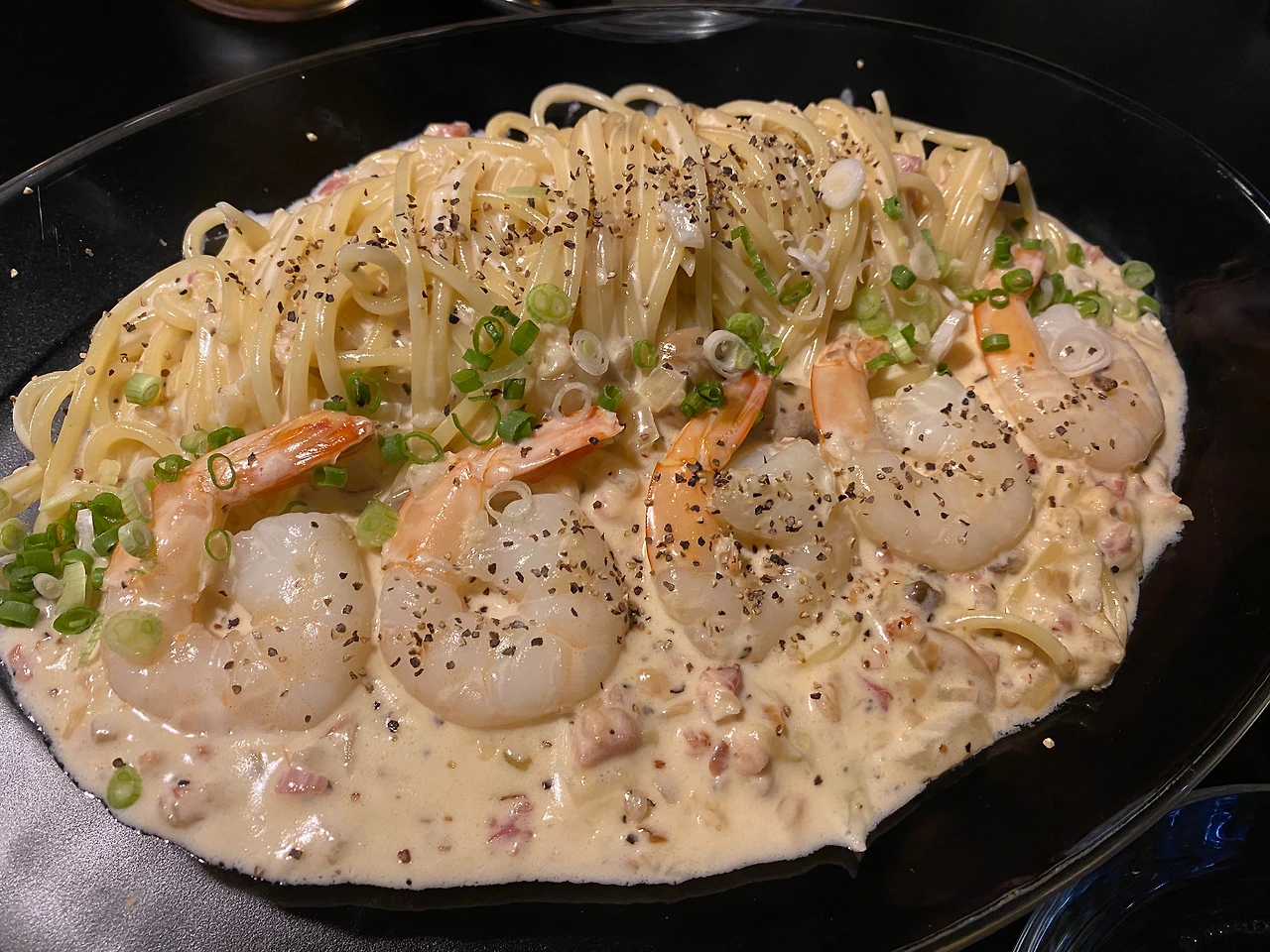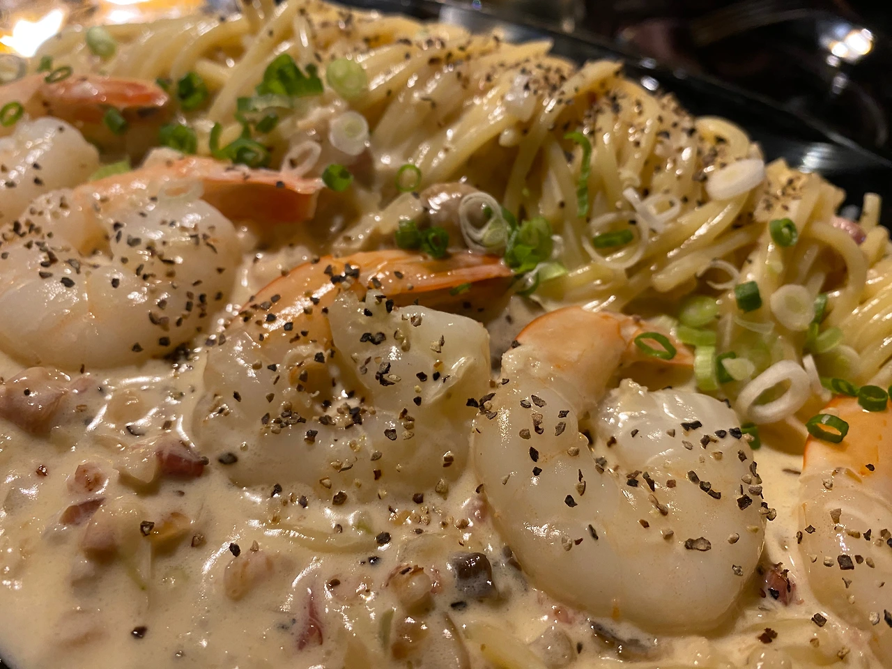 등장한 지원군이다. 오, 플레이팅이 근사하다. 파스타면이 한쪽에 치우쳐져 있어 새우를 소스에 찍어 먹기도 크림소스만 한 스푼 떠먹기에도 좋다. 든든한 백업요원이었다. 그리고 꾸덕감이 굉장히 좋다.