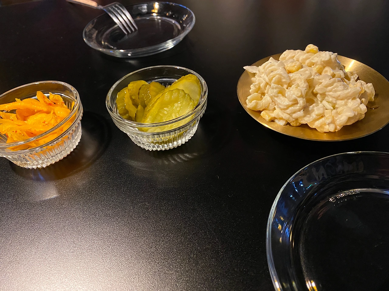 기본으로 나오는 단무지무침, 피클, 푸실리&콘마요샐러드인지 함께 나왔고.