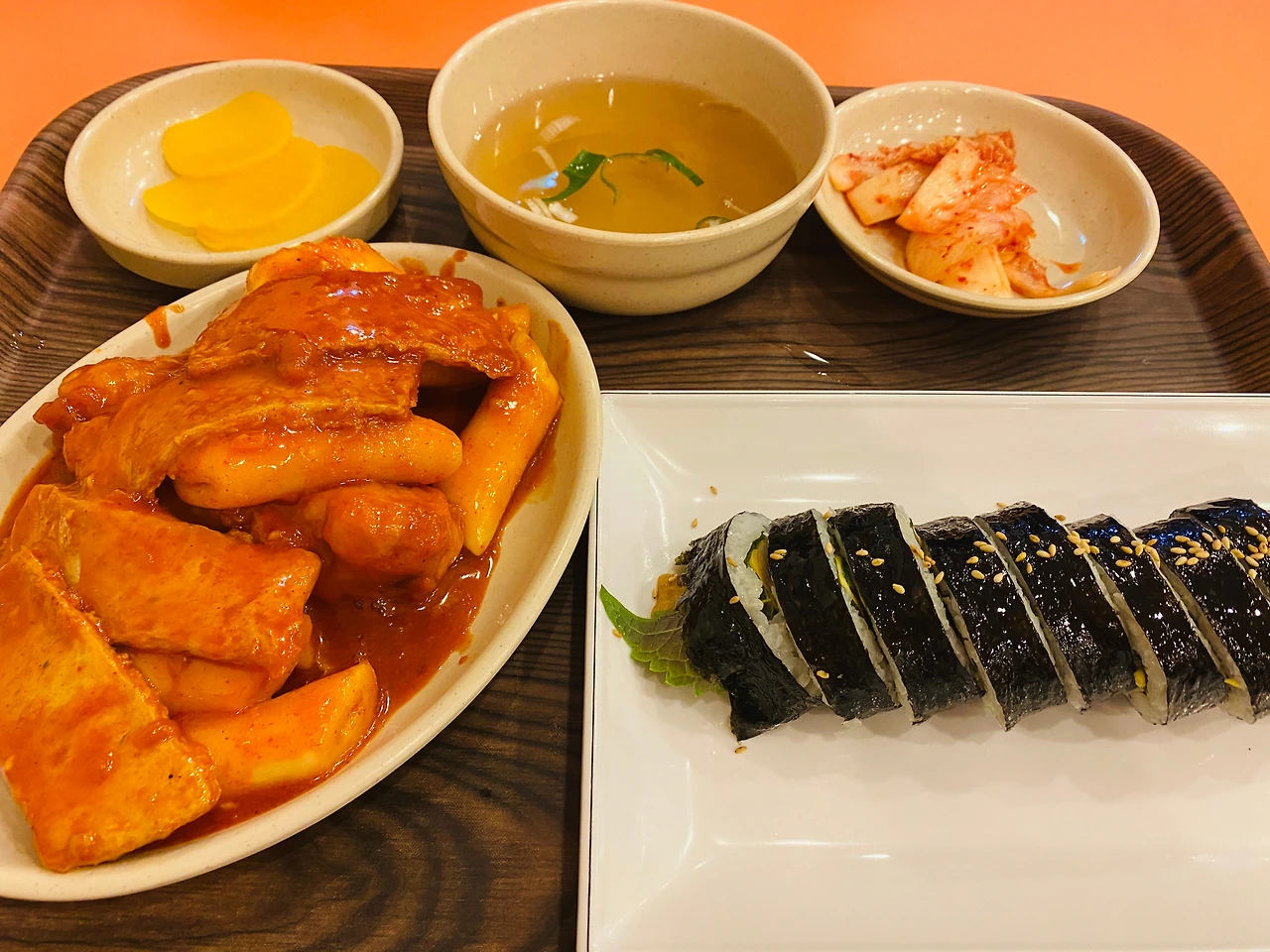 등장한 익숙한 외모의 떡볶이와 김밥이다. 떡볶이는 모듬 1인분으로 김말이 2개도 들어가 있다. 필자의 경우 계란도 1개 추가. 찬은 국물과 단무지가 기본으로 나오는데, 김치와 물은 셀프바를 이용.