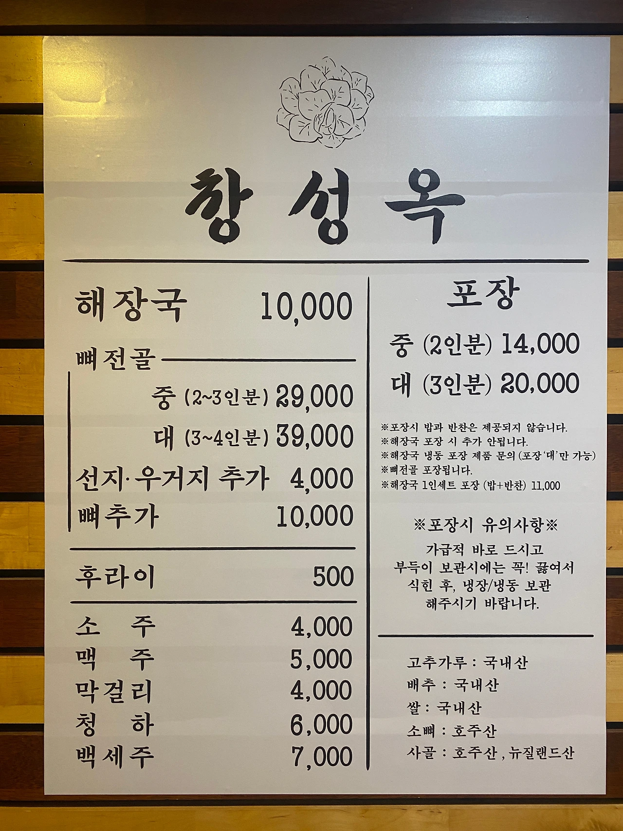 먼저 메뉴판이다. 음, 슬프게도 10,000원 해장국의 시대에 살고 있지만, 위안 삼자면 그래도 옆 동네 공덕 대비 나쁘지 않은 가격대. 포장 관련 안내가 꽤나 디테일하다. 그리고 메뉴는 오로지 해장국과 뼈전골뿐. 상당히 마음에 든다. 후라이는 가게의 상징격으로 서비스 중인 듯한데.