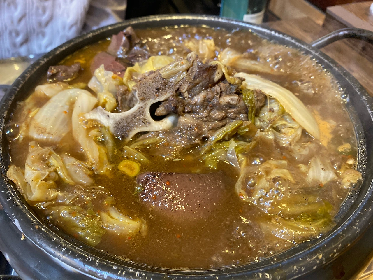 허나 바로 등장한 뼈전골에 압도 당했으니. 오호라, 한눈에 봐도 보통내기가 아닌 듯한 느낌. 선지해장국은 익숙하지만 조합이 새롭다. 푹 삶아진 배추와 선지, 양념장의 역할을 하는 듯한 파다대기까지.