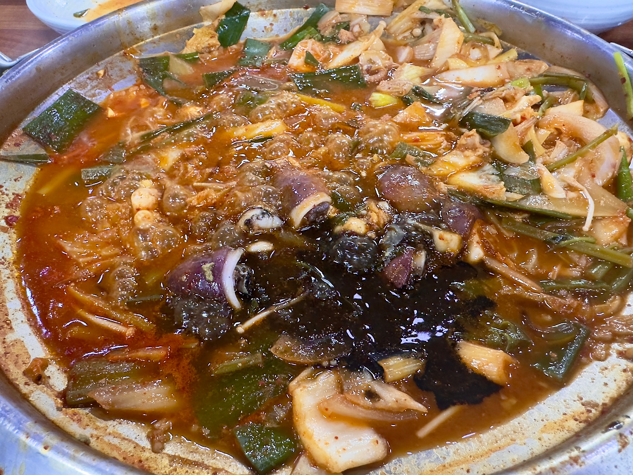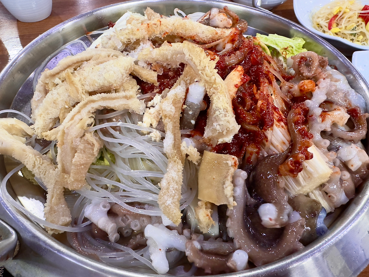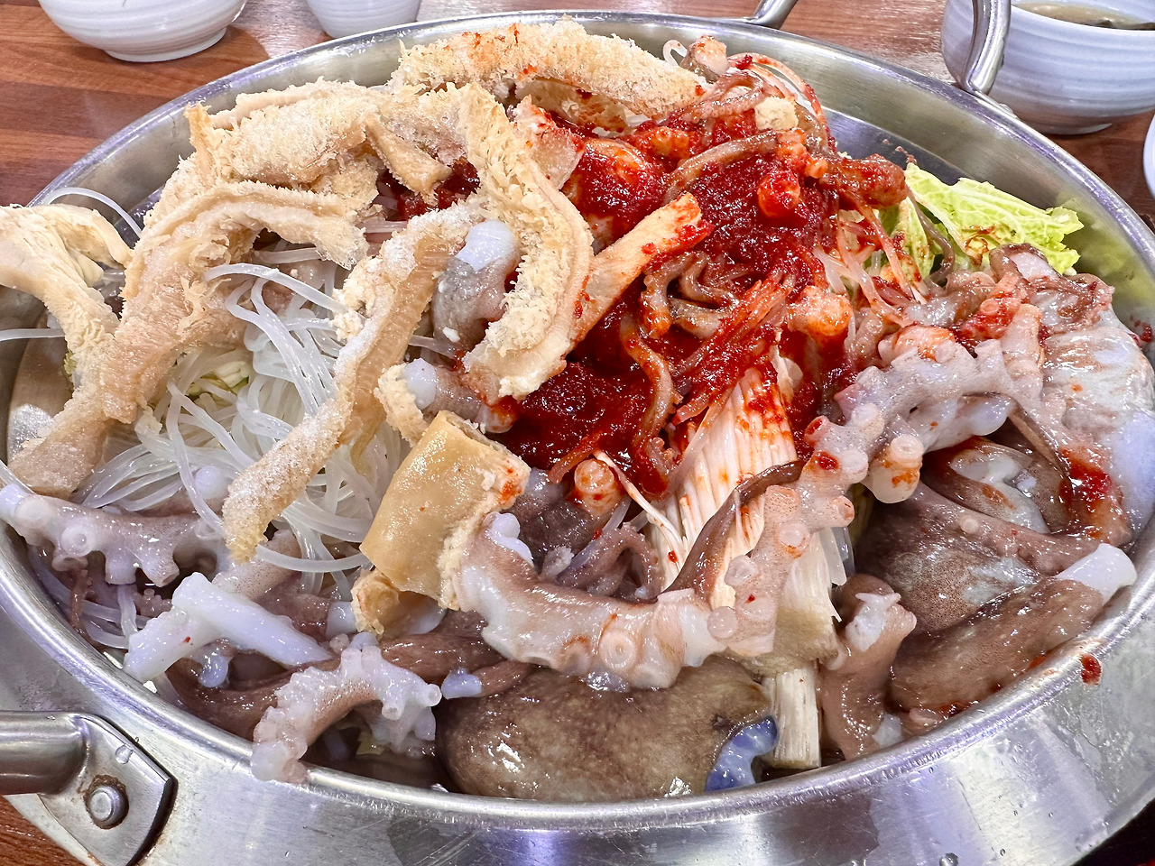 여하튼 간 이제 끓기만을 기다려주면 되시겠다. 먹기 좋은 타이밍에 사장님이 찾아와 가볍게 손질을 해주시고 시식 스타트를 끊어주시는데. 좋다. 가족들과 함께하는 명절에 만난 '충무할매낙지볶음'. 시원한 국물은 여전하구나. 머리는 쉽게 익질 않기 때문에 한쪽에서 좀 느긋하게 끓여두고 당면과 함께 나머지 녀석들을 먼저 후루룩 즐겨주면 된다.