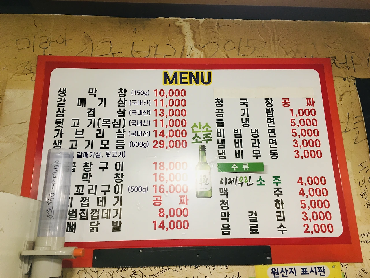 메뉴판. 마포 갈매기 골목에 비하면 그럭저럭 저렴한 가격이 편이긴 하다. 무엇보다 눈이 가는 것은 껍데기와 청국장이 공짜라는 점. 처음에만 서비스로 내준다는 것인지 추가 리필이 가능한 건지 궁금해지는구나.