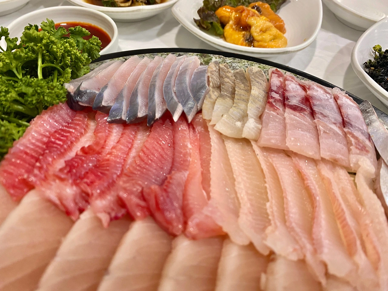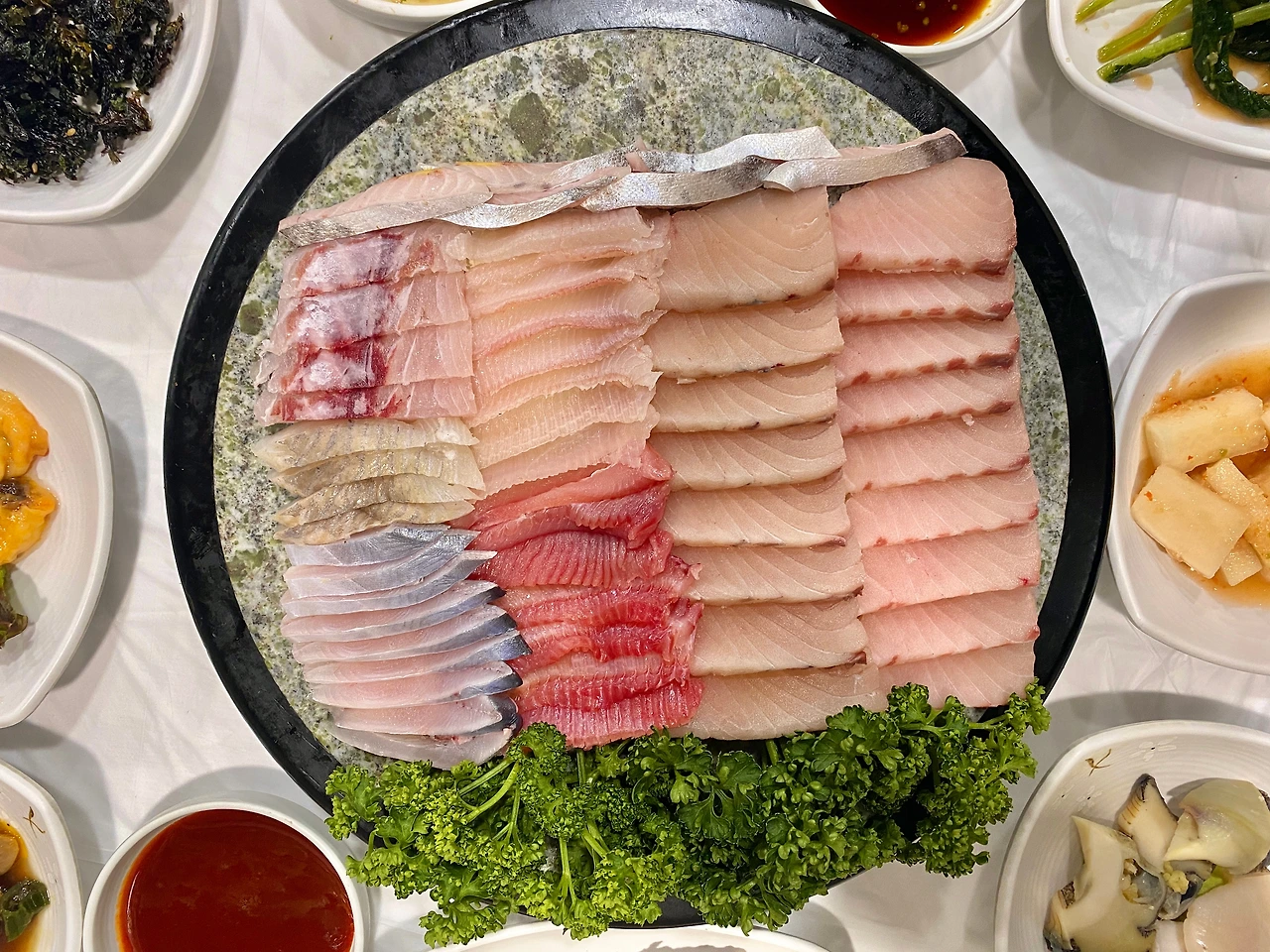 위에서부터 차례로 병어, 도다리, 민어, 노랑가오리(붉은 회), 간재미, 삼치 두 줄. 우측으론 병어 뱃살.
