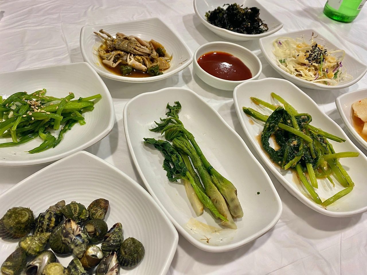 두릅, 열무 등 각종 찬들이 세팅되기 시작. 놀라운 점이라면 세팅이 끝난 줄 알았으나, 무서운 스피드로 추가 해산물 찬들이 계속해서 등장한다. (홍합국, 칠게장, 낙지, 새조개관자, 소라숙회, 멍게 등.)