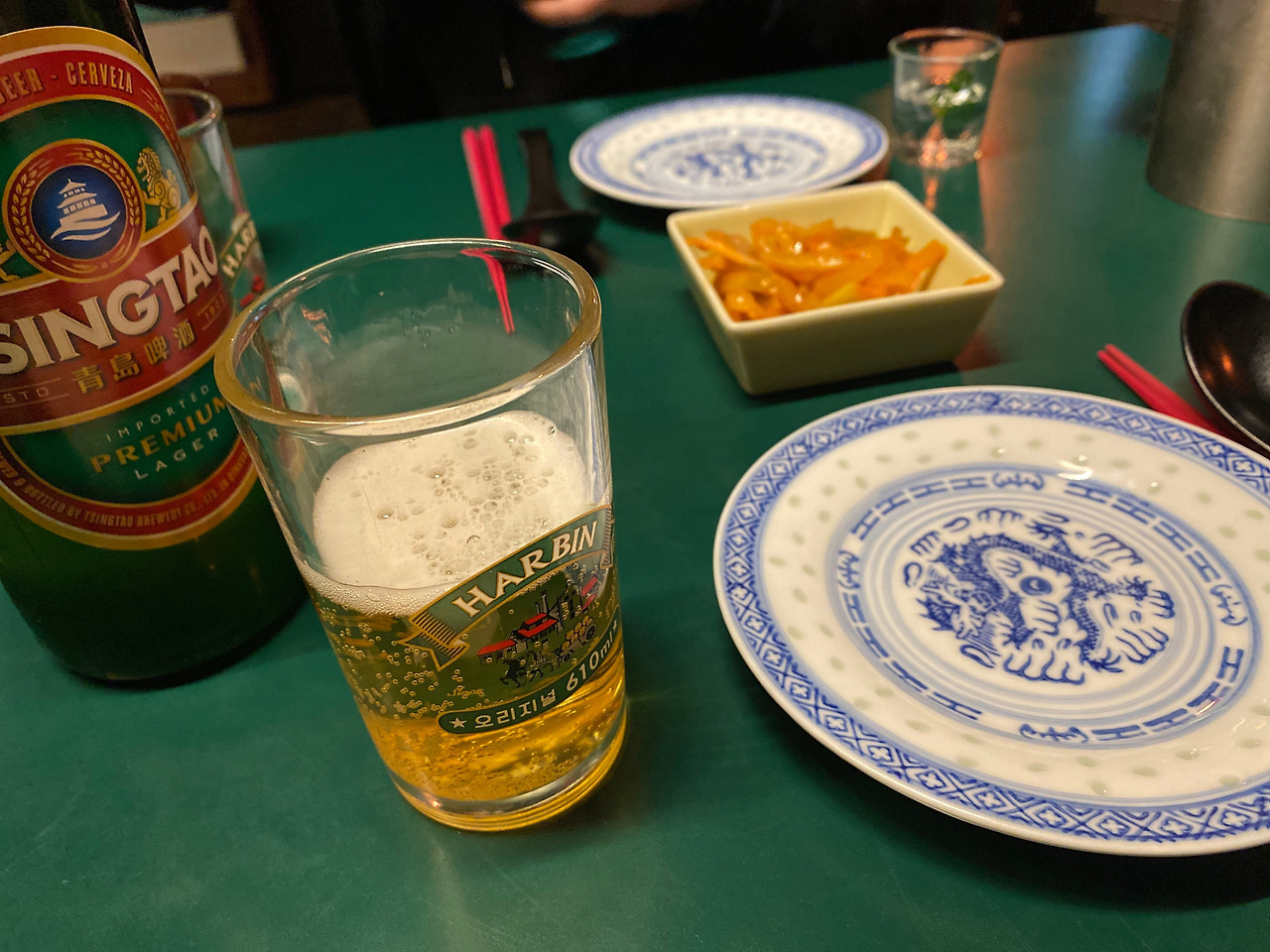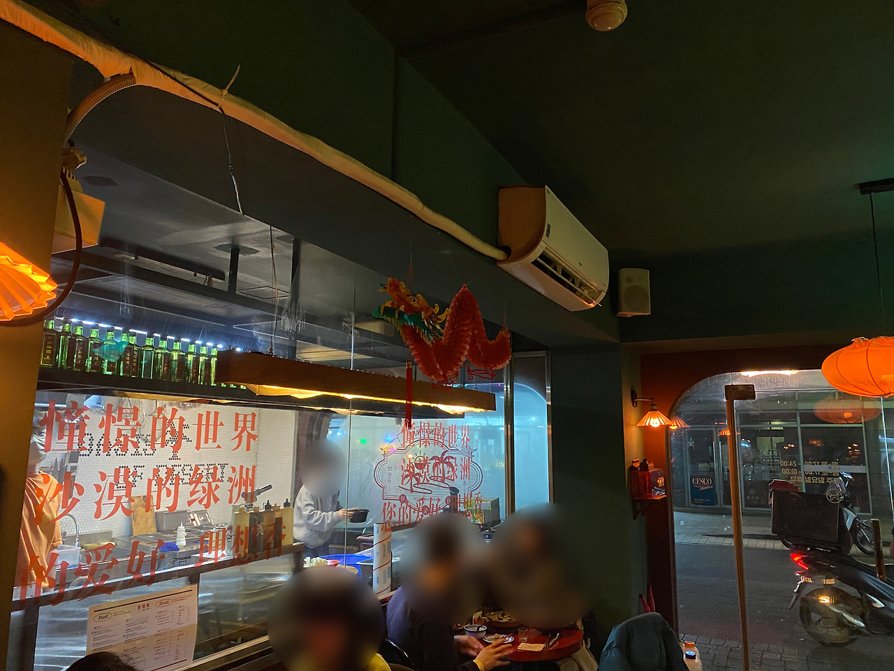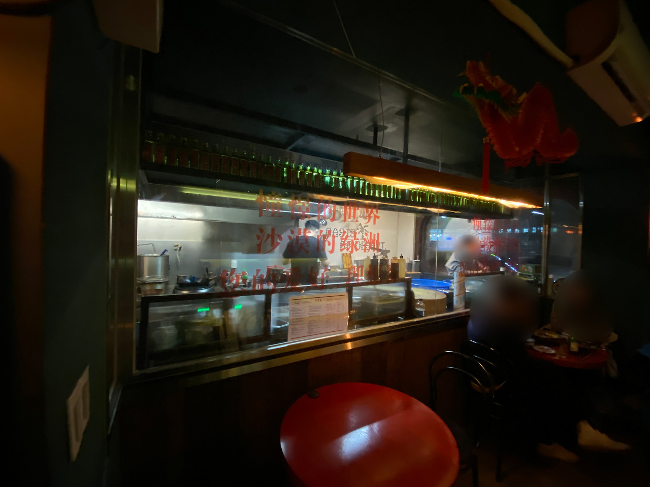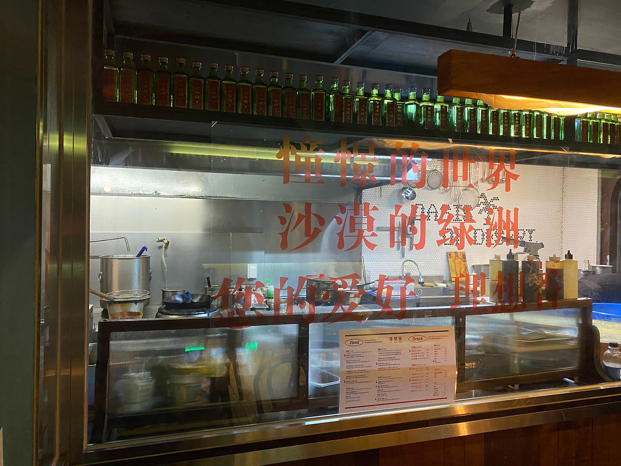 술 한잔하기도 전에 분위기에 취한다. 주방이 보이는 창문, 살짝 투명한 톤의 빨간 한자와 습기 찬 뿌연 창문. 빼갈병들 또한 서포트를 해준다. 그래, 그거구나. 이 가게 내부의 색감 왜 이리 익숙한가 했더니 고량주 병의 색상이다.