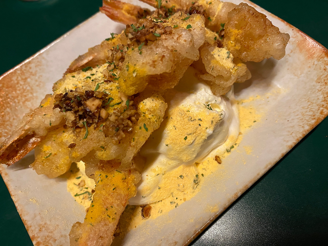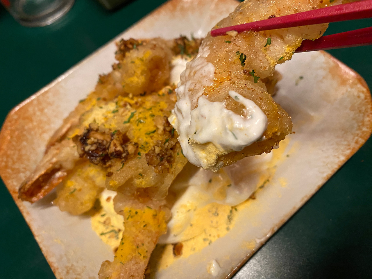 감귤일지, 유자일지 그런 파우더와 레몬이 석인 듯한 새콤한 크림. 어느 정도 느끼함을 방어해 준다. 小짜로 주문해 다행이다 싶었는데, 넉넉하게 즐기기엔 어쩔 수 없이 끝에선 크림의 느끼함이 치고 올라오기 때문. 그래도 처음 느끼는 새로운 조합. 퓨전 중식을 즐기는 이들은 만족스러워할 요소다. 때문에 데이트 술집의 곁들임 안주로는 추천할 만하겠다.