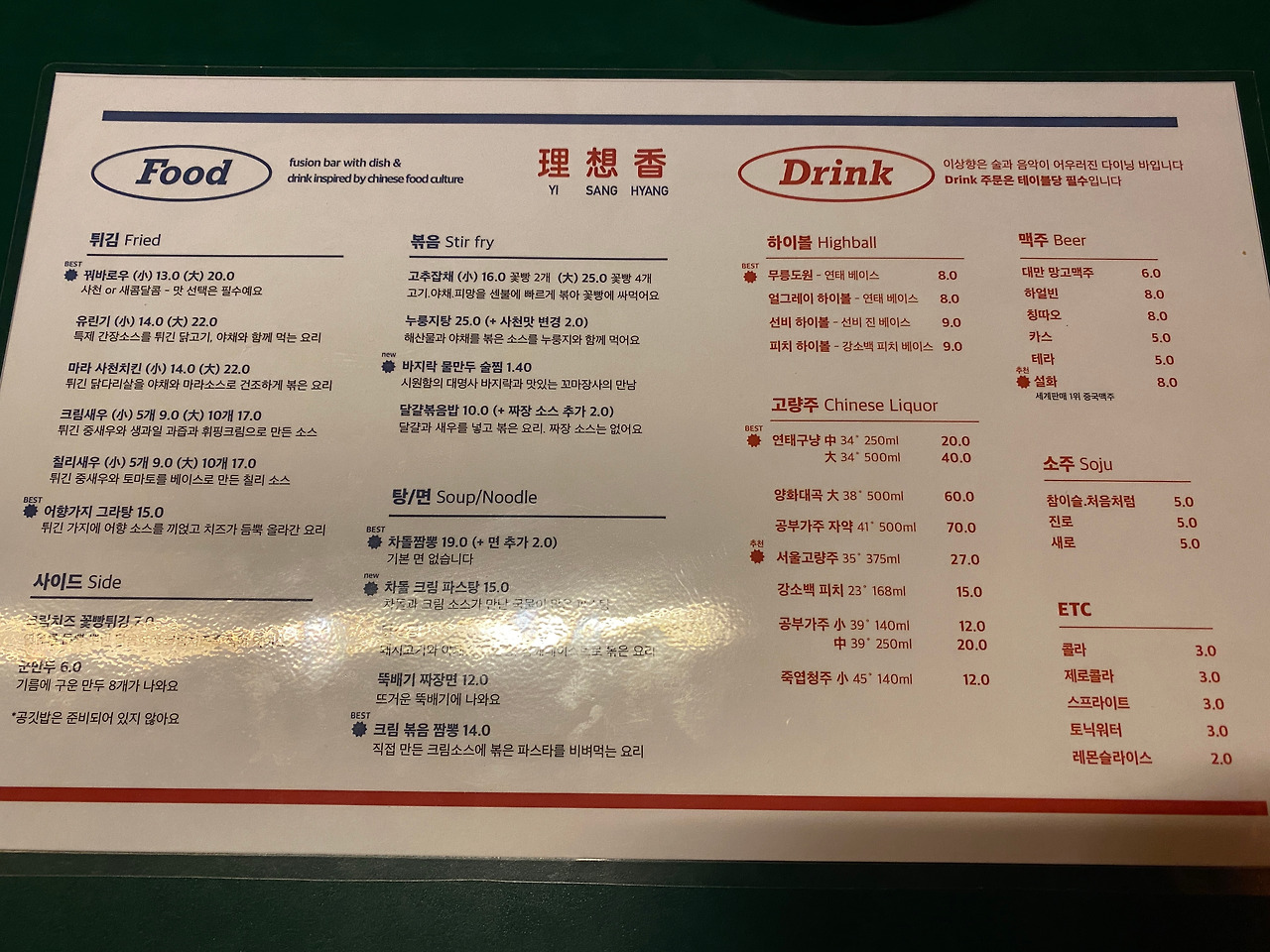 내부를 관찰하다 보니 음식은 뒷전이구나. 메뉴판을 살펴보자. 아, 조금 더 특별한 중식을 원했는데, 아쉽게도 한국에선 꽤나 익숙한 중식 위주다. 익숙한 메뉴 기반에 퓨전을 가미. 필자의 경우 빛으로 가려진 메뉴판의 탄탄면을 접하다가 이후 크림새우 小짜를 주문했다. 주류는 중식당의 익숙한 술들이나 대만 망고맥주는 또 처음이다. 하이볼이 있는 것도 독특한데, 역시 분위기 술집답다.