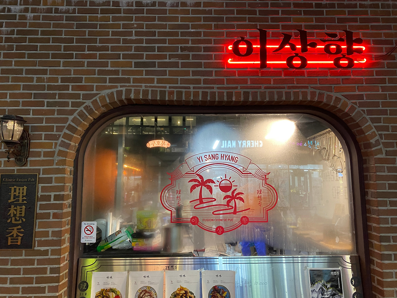 '이상향', 가게 외부의 한자는 '향기 향(香)'을 썼더라. 습기가 찬 주방 쪽 유리창엔 사막 속 야자수를 형상화한 것 같은데, 이상적인 곳, 이상적인 맛을 추구한다는 중의적 표현인가 보다. 여하튼 끄트머리가 둥근 모양의 두 개의 통창.