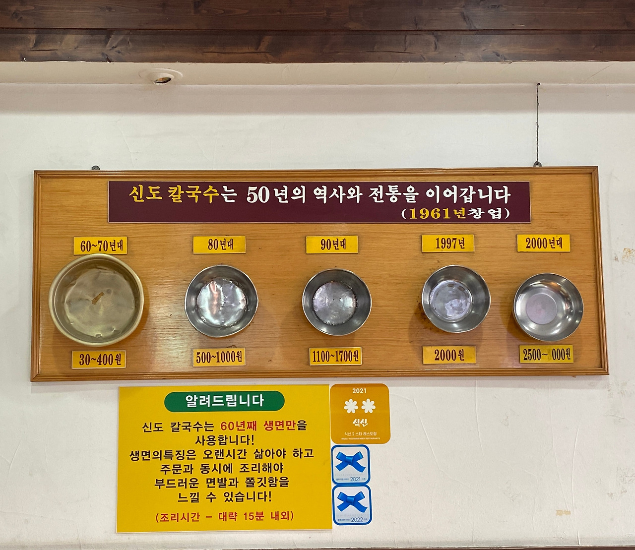 그릇으로도 깊은 역사를 자랑하는 집. 진정한 노포 인증이지 않은가? 기술했다시피 15분이 걸릴 수 있음에 대한 안내. 참고하면 좋겠다. 필자가 방문했을 당시 어느 손님도 기차시간으로 몇 젓가락 후 바로 나갔으니 말이다. 블루리본서베이의 마크도 붙어있는 것인가? 도서를 구매했는데 여기서 보니 반갑다.