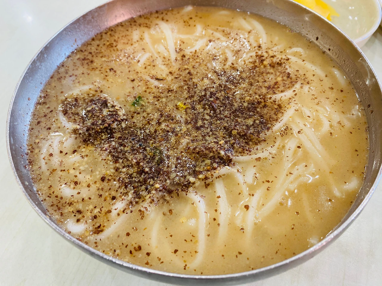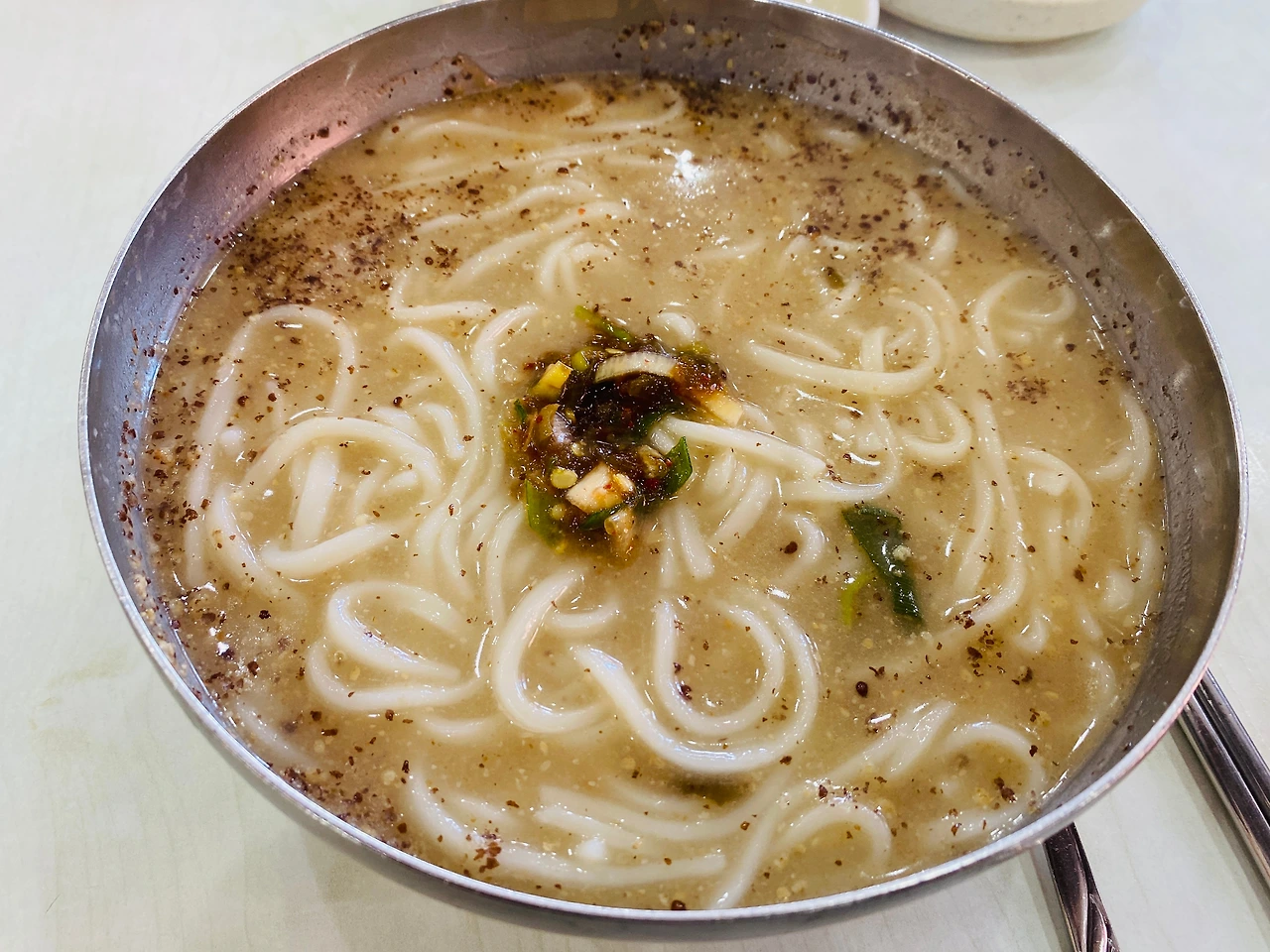 - 들깨와 사골, 멸치 베이스의 육수가 함께 하는 진하고 깊은 풍미의 칼국수. 이 오묘한 조합 탓인지 닭 육수와도 같은 느낌도 받는다.