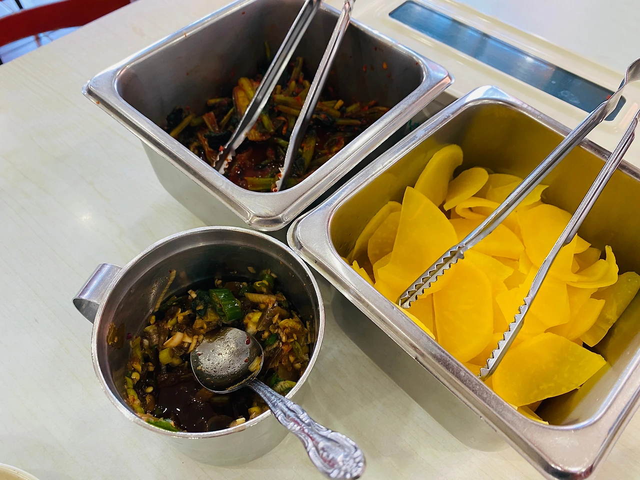 자, 역사 흔적 탐방은 마치고, 본격적인 시식 준비. 찬은 다소 아쉽다. 열무김치와 단무지. 그래도 칼국수엔 겉절이 김치의 취향을 최고로 치는 필자다. 더불어 간장 베이스의 양념장.