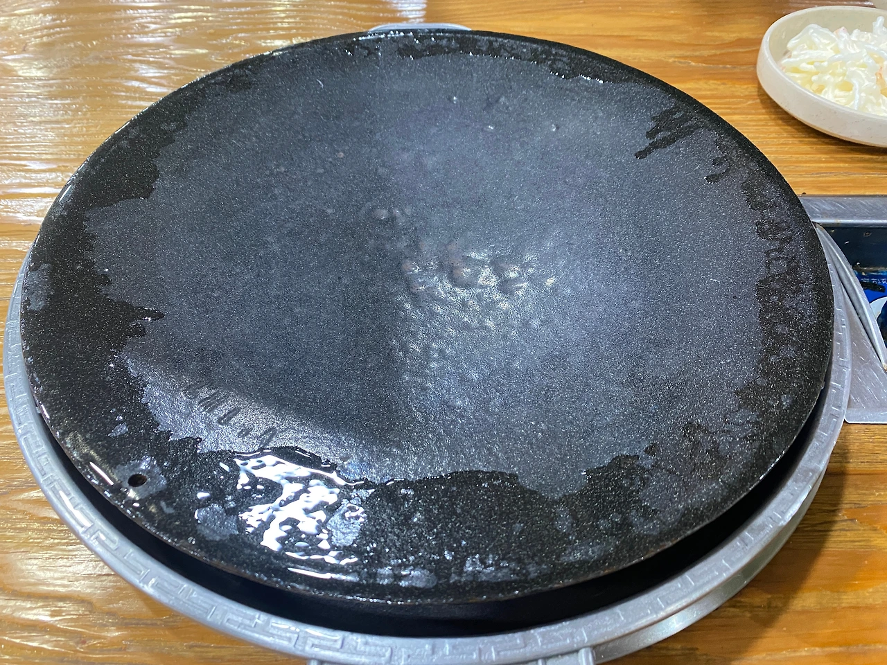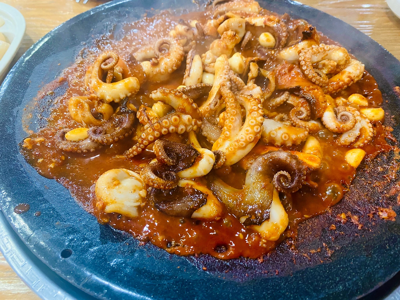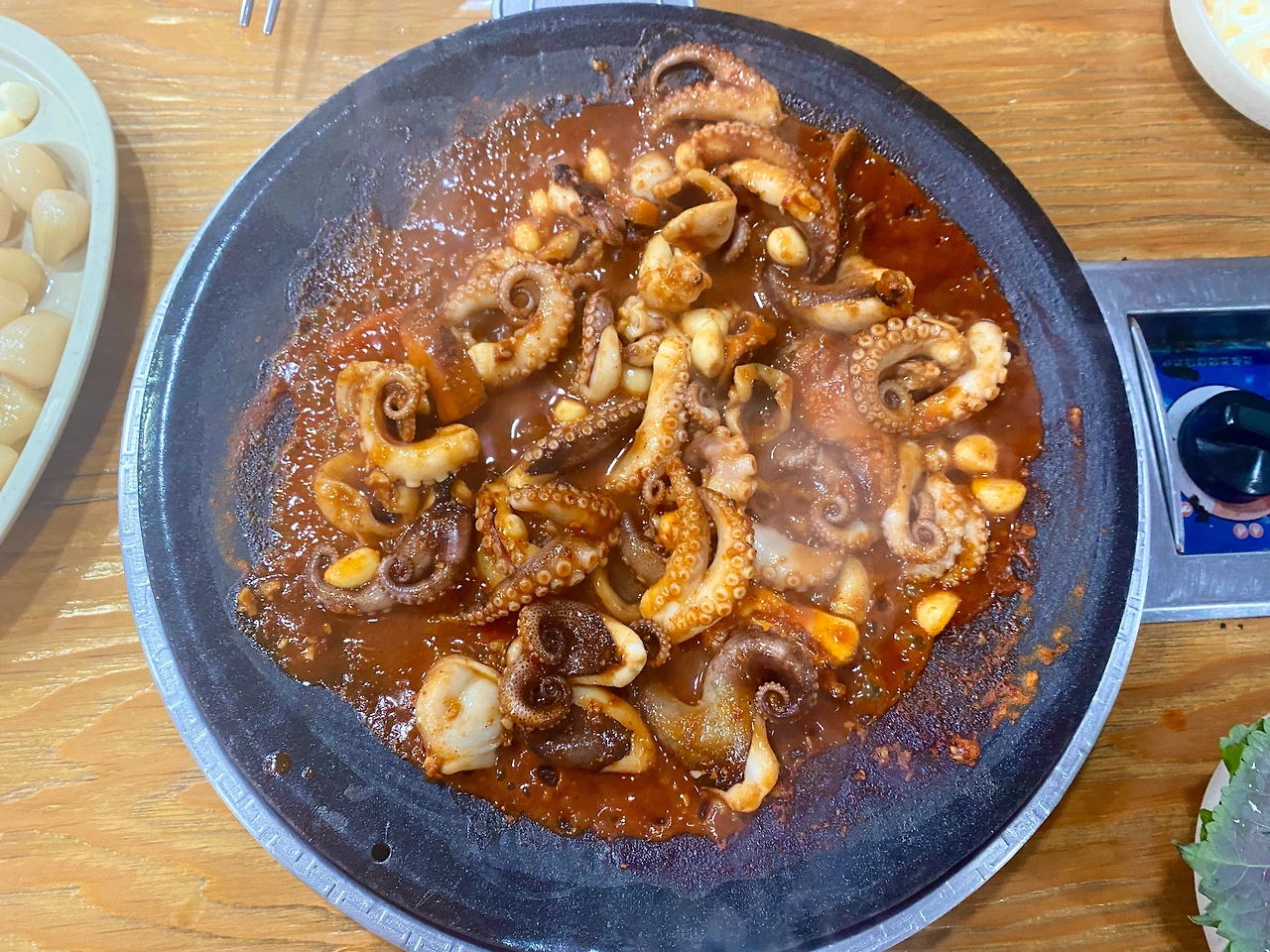 앉자마자 쭈꾸미를 볶을 판이 먼저 등장했다. 대전의 석갈비가 생각나는 둥근 판. 가게는 붐비지만 이후 쭈꾸미는 일사천리로 등장한다.