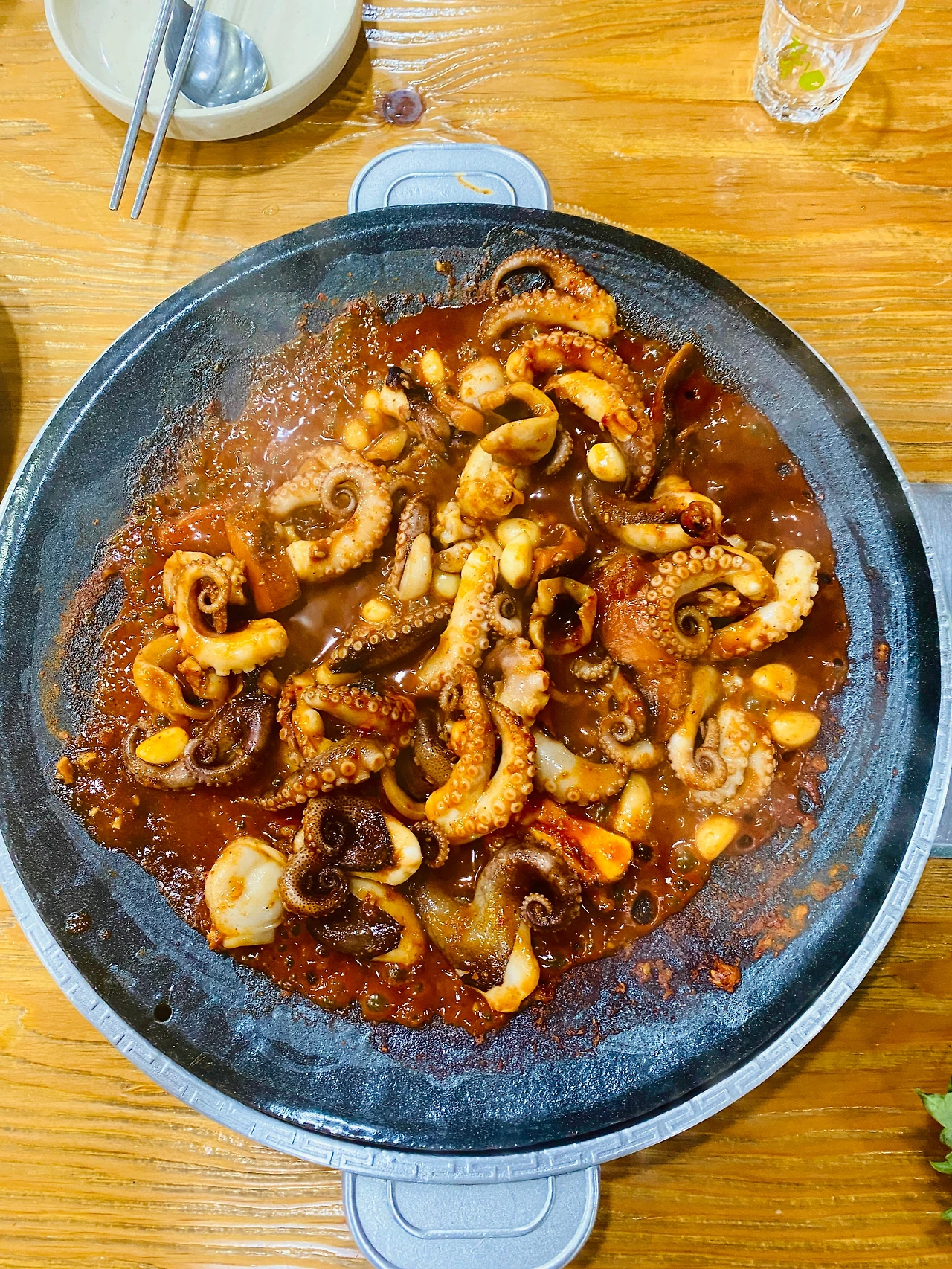 이제 본격적으로 볶을 시간이다. 표고버섯과 함께 양념된 쭈꾸미. 금세 끓기 시작하는데. 철일 때만 온전한 머리를 먹을 수 있나 보다. 그것보다 한창 전에 이곳을 즐겨 찾던 연인의 초조함을 보는 것도 묘미다. 확실히 '봉희설렁탕'도 그렇고 자주 찾던 곳에 공백기가 생기면 아쉬운 점이 잘 보이고, 실망하기 일쑤인데.