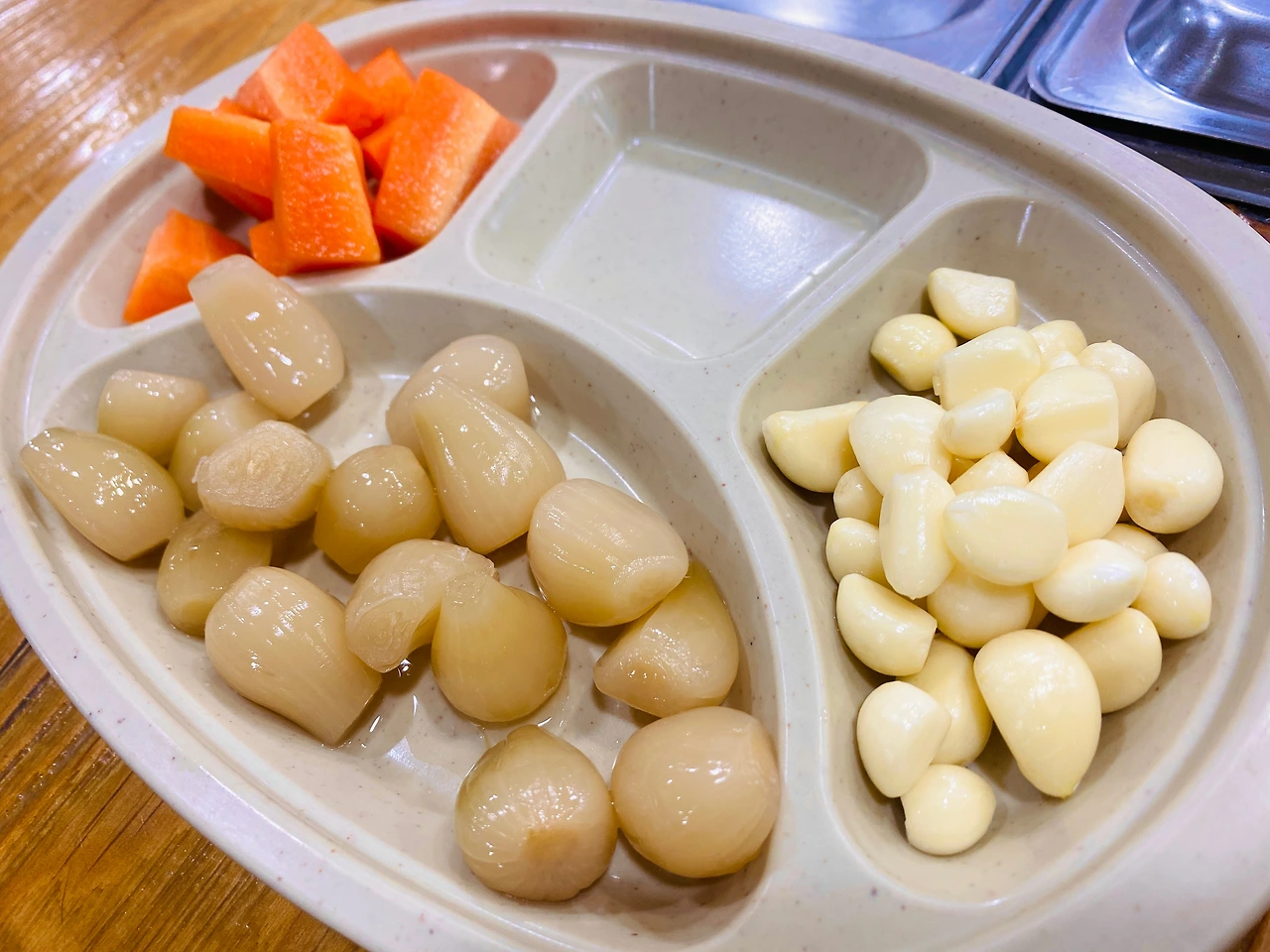 당근, 락교와 마늘. 나정순할매의 쭈꾸미 세계관에서는 쭈꾸미에 마늘을 붓는 것이 유명하다.