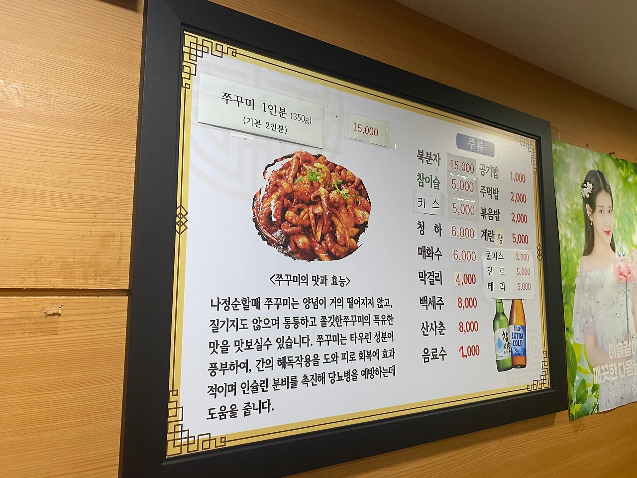 메뉴판은 중요하지 않다. 이곳에서는 앉자마자 인수대로 쭈꾸미를 내오기 때문. 어찌 보면 노하우나 요령이겠으나 주류, 등 부가적인 것이 필요할 수도 있기에 서비스적으로는 조금 아쉬운 부분이다.