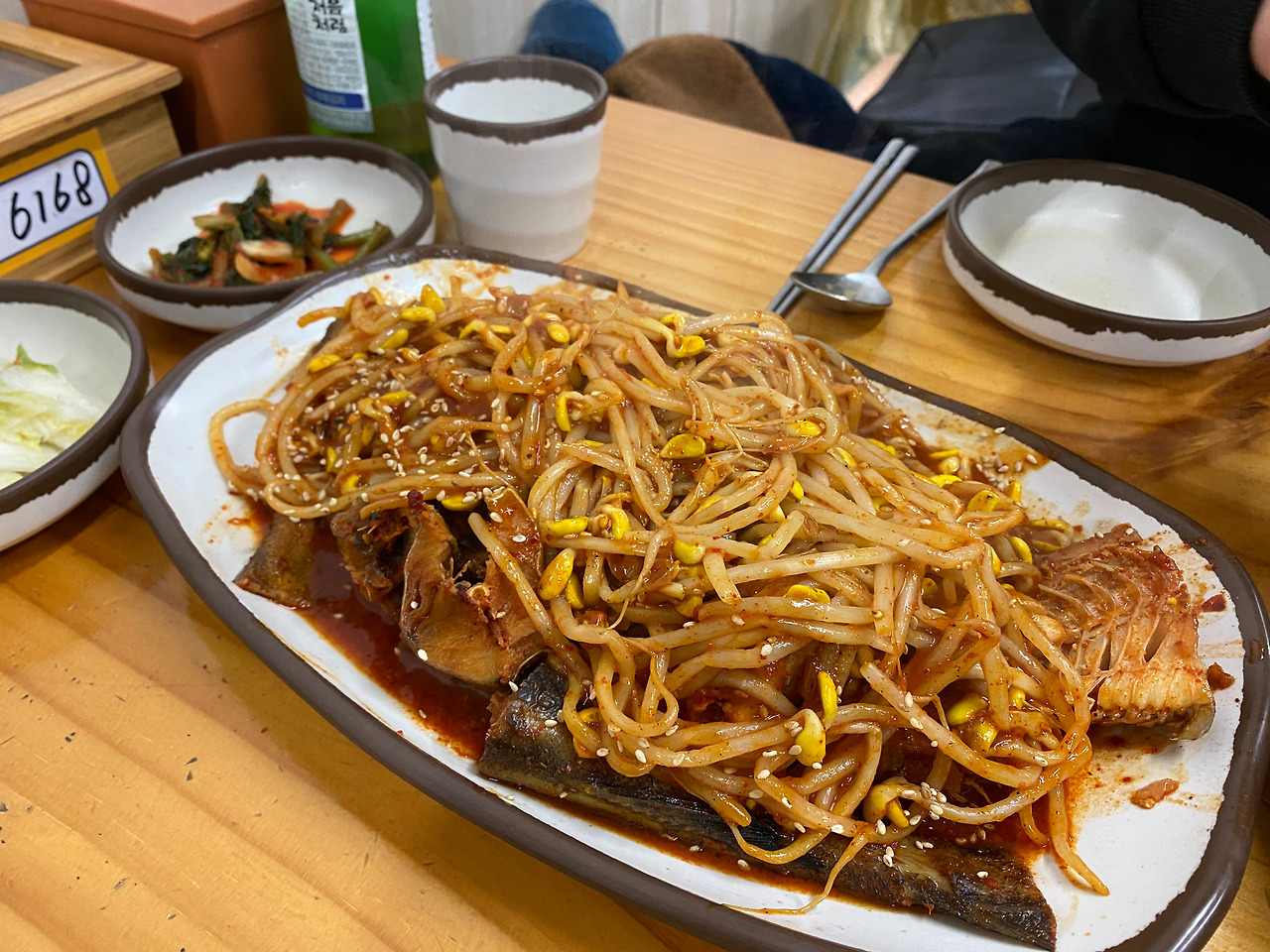 그렇게 인고의 시간. 기다리던 끝에 나온 코다리찜이다. 코다리찜의 경우 콩나물이 들어간 아구찜 비슷한 방식으로 나온다. (조림은 콩나물이 없다.) 콩나물 한 점 크게 집어 넣어보는데. 음, 좋다. 맵기가 조금 있는데, 기분 좋은 맵기. 아구찜에 대한 대체재로 충분히 해소가 되는구나.