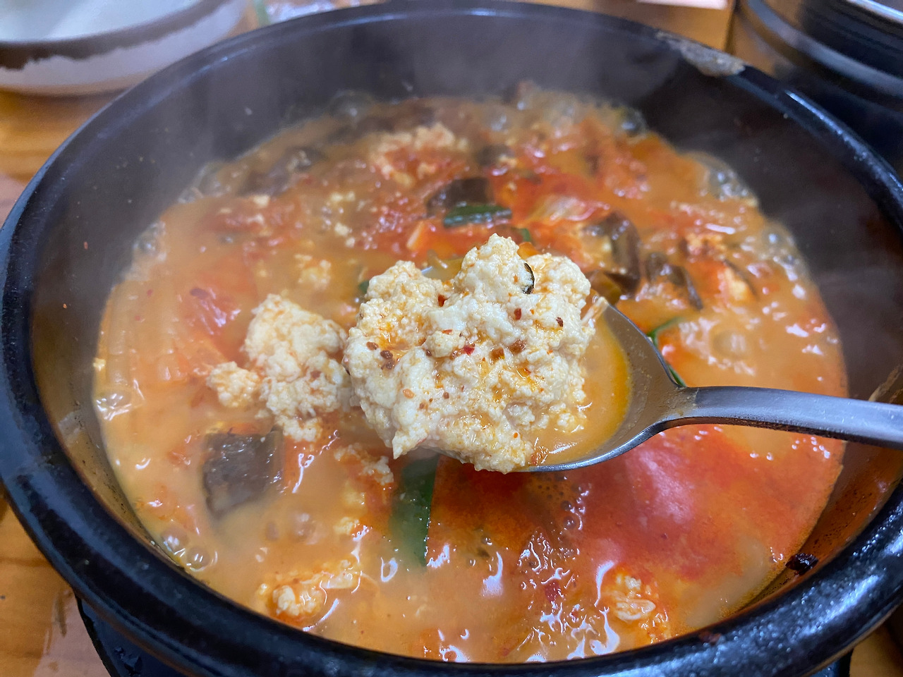 이어 등장한 얼큰 순두부. 역시. 두부를 직접 만드는 집답게 정통 순두부의 스타일이다. 알갱이가 몽글몽글 피어오른 듯한 두부. 북창동식 순두부찌개와는 다른 칼칼한 신김치 베이스의 김치순두부에 가깝다. 집에서 끓여주던 옛날 순두부의 맛. 응암동에서 초당순두부를 만난 느낌도 든다.
