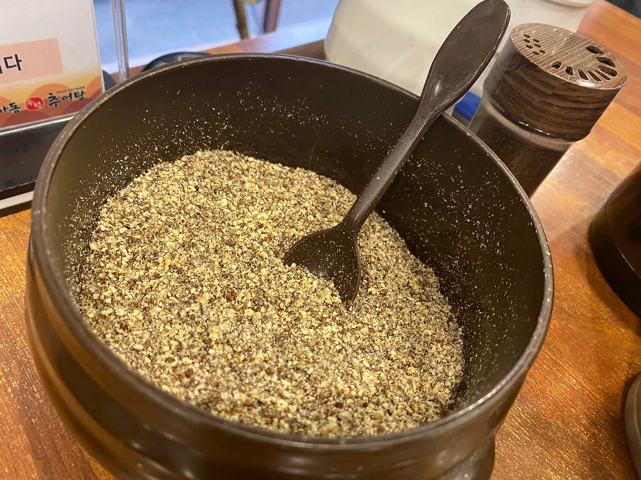 그래도 지금도 필자의 취향은 전라도식 추어탕, 이곳 '하동우렁추어탕'의 상호는 경상도지만 우렁이 녀석만 하동의 우렁각시인가 보다. 남원식 추어탕과 흡사하다. 자, 익숙한 들깨가루와 산초가루 통도 있으니 기호에 따라 첨가하면 되겠다.